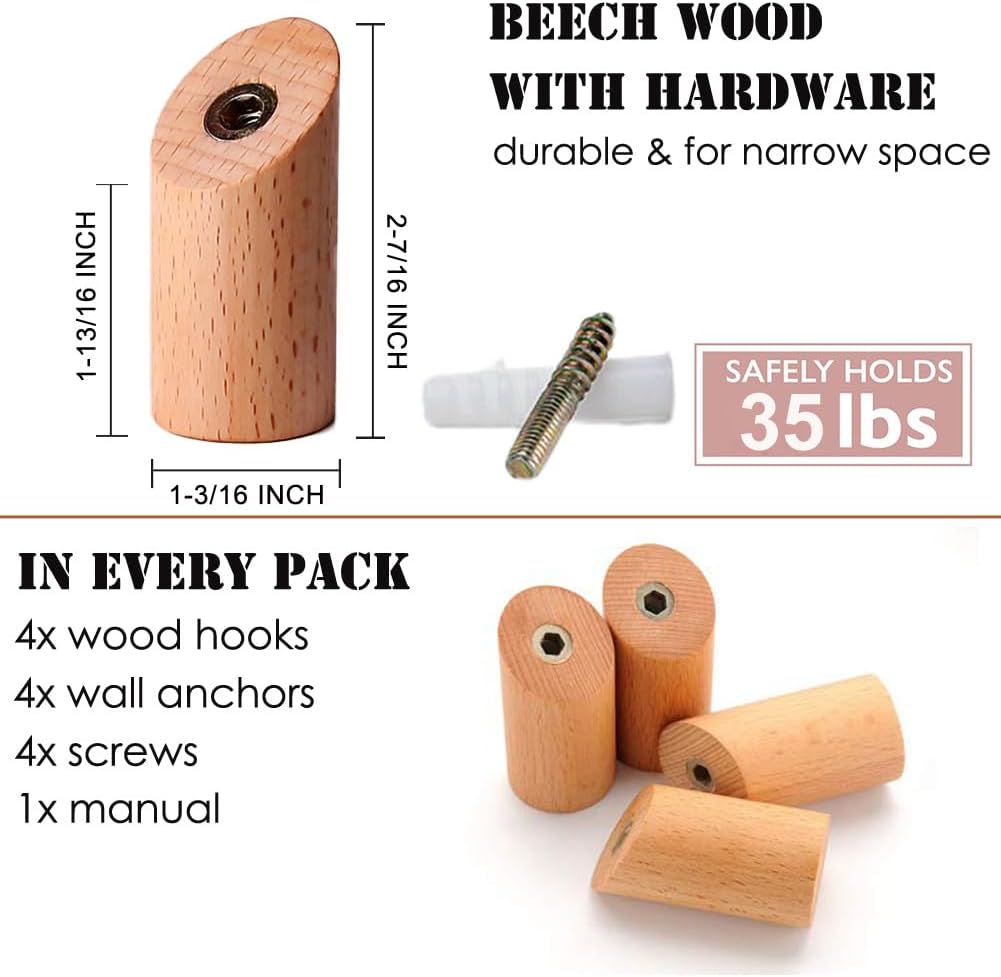 Wood Wall Hooks, 4 Pack Coat Hooks Mounted Rustic Wooden Heavy Duty Robe Hook Hat Rack | for Hanging Bathroom Towels Clothes Hanger (Beech Wood)