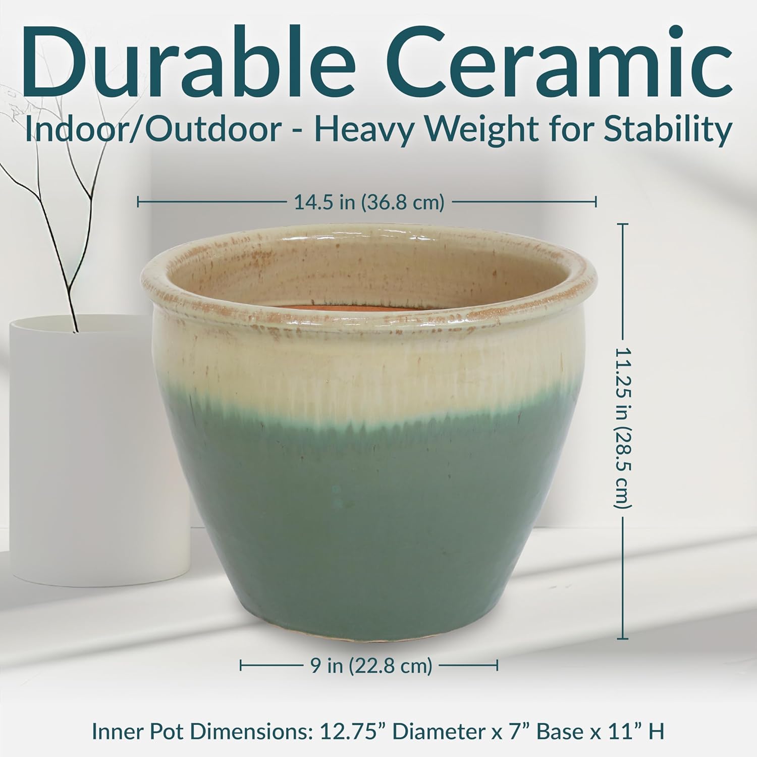 Sunnydaze Chalet Large Ceramic Plant Pot - Round Outdoor Glazed Ceramic Planter Pot with Drainage - Seafoam - 14.5"