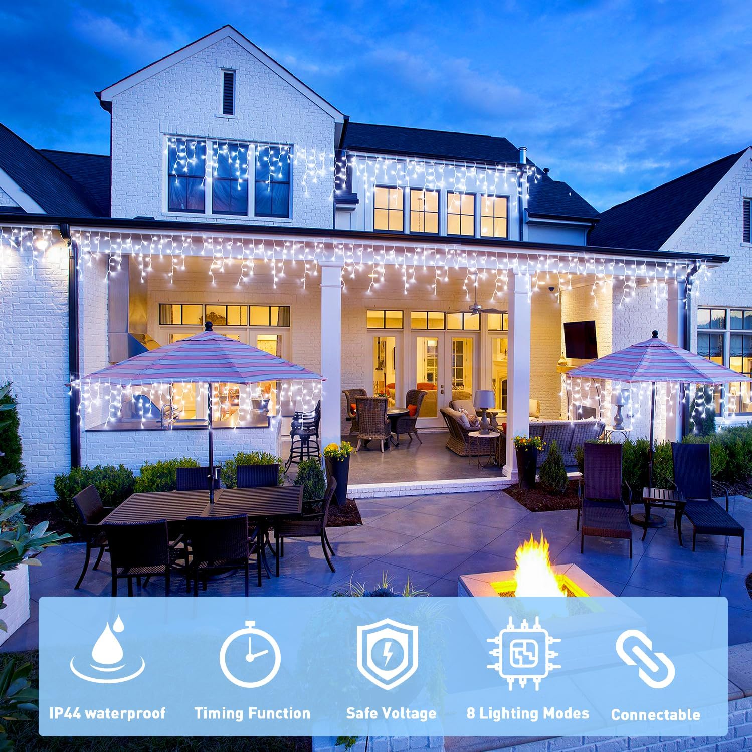 • 【8 Lighting Modes & Timer Function 】 Icicle Christmas lights with 8 different light patterns: Combination, In waves, Sequential, Slo-Glo, Chasing/Flash, Slow fade, Twinkle/flash and Steady on. Different modes represent different moods. Our icicle lights also have timing function, which automatically turns on for 6 hours and turns off for 18 hours