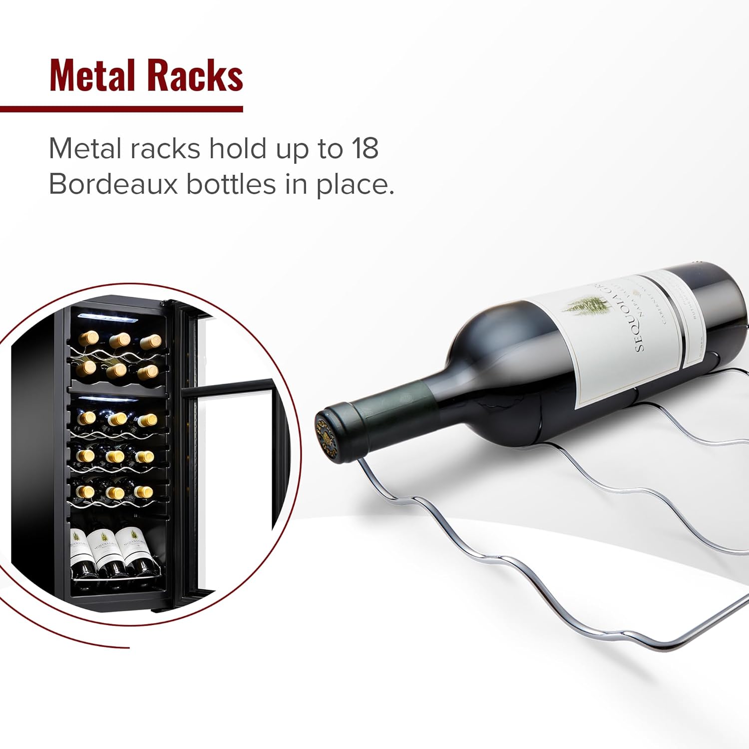 • 18-Bottle Wine Fridge Capacity: Store up to 18 standard wine bottles in a sleek, compact design. Whether you're a wine enthusiast or just starting your collection, this mini fridge offers ample space to preserve and display your wines