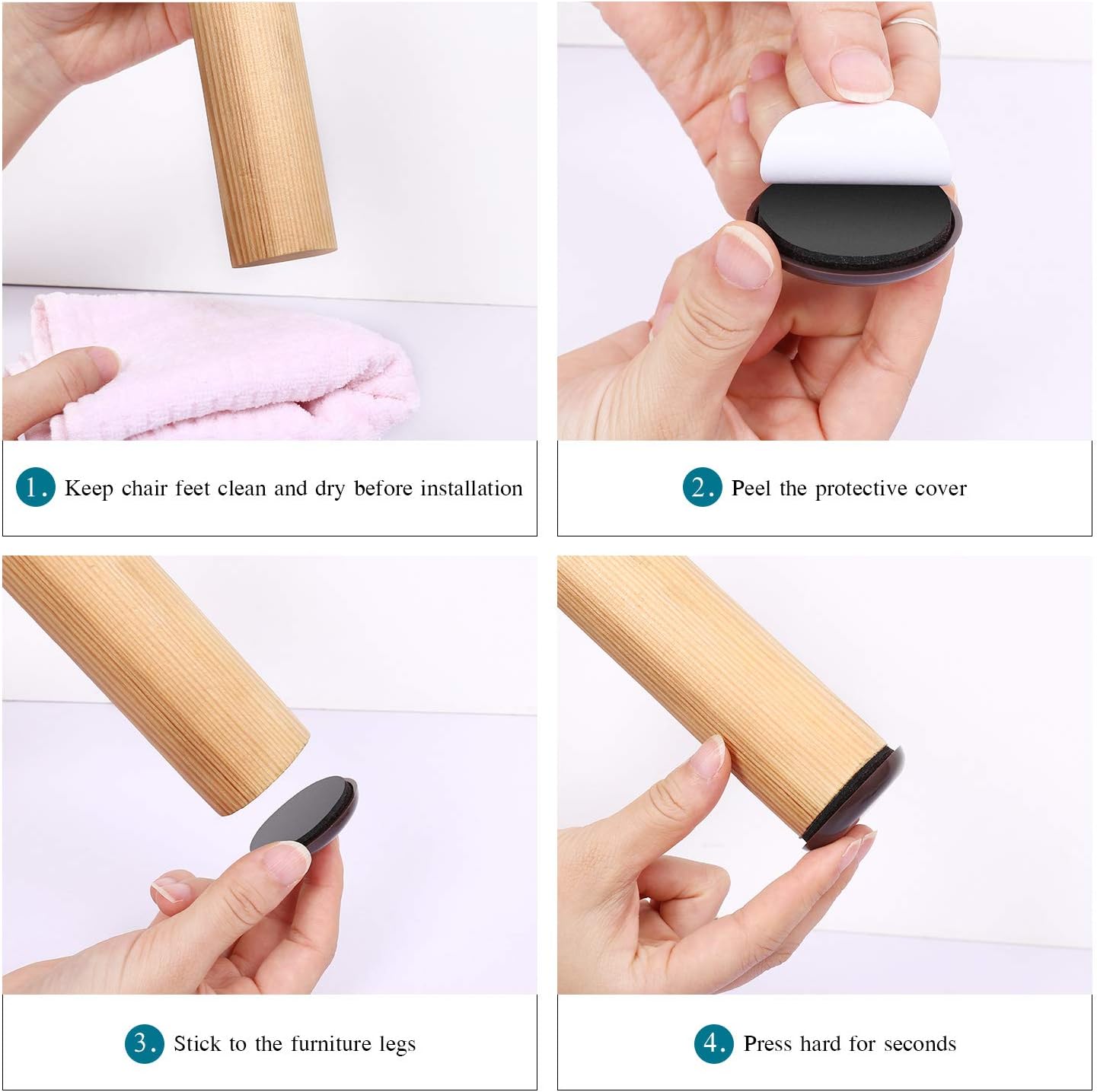 • ☛【Easy To Use】- 1)Please clean furniture legs & dry the surface. 2) Peel off the white protective cover form the furniture slider . 3) Stick to the furniture leg. 4) Wait 1 hour for max hold.