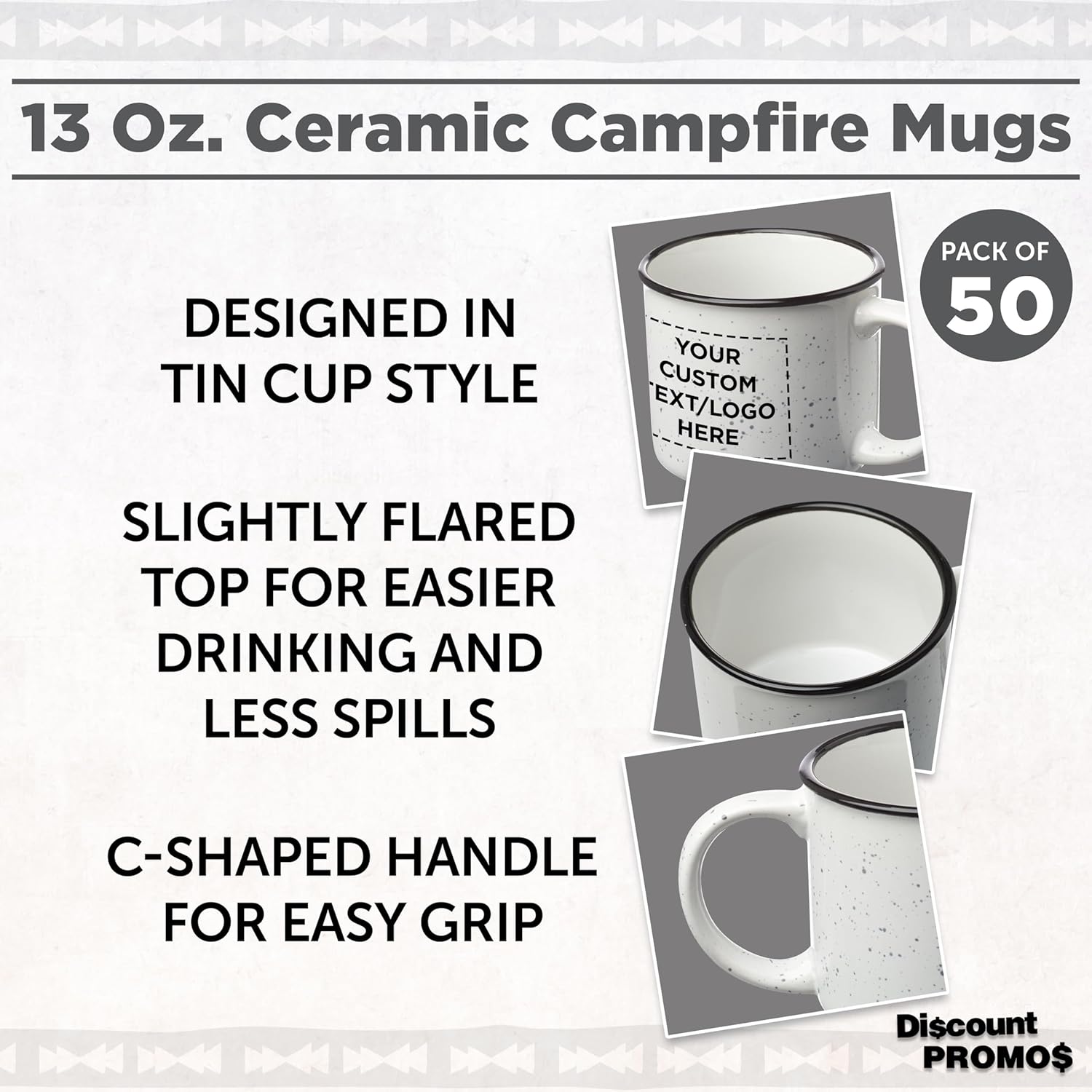 DISCOUNT PROMOS Custom Ceramic Campfire Coffee Mugs 13 oz. Set of 50, Personalized Bulk Pack - Perfect for Tea, Espresso, Cappuccino, Hot Cocoa - White