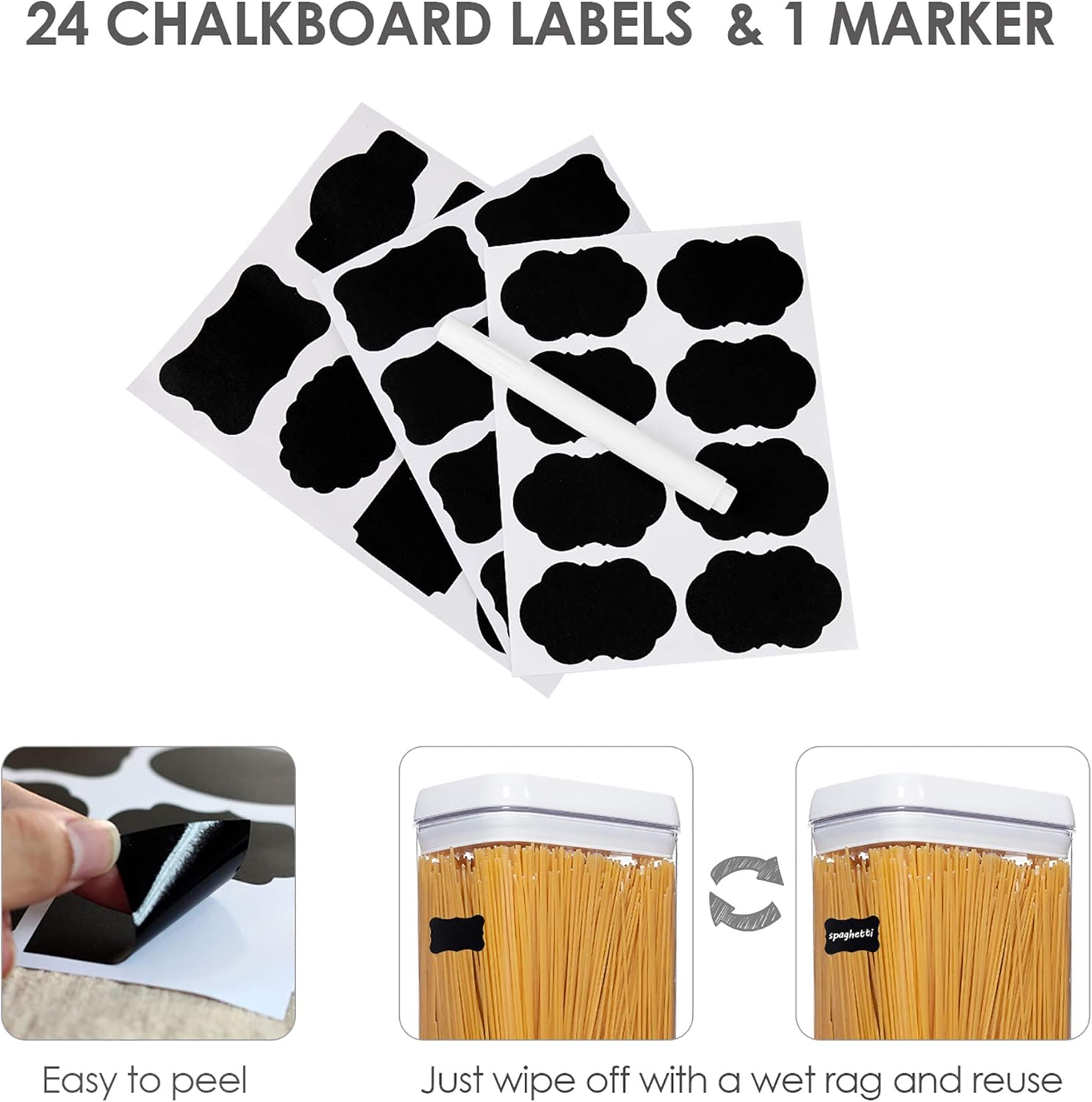 • 24 Reusable Labels----These labels will help you never confuse flour with powdered sugar or baking powder with baking soda. They are reusable, you can switch contents whenever you need.