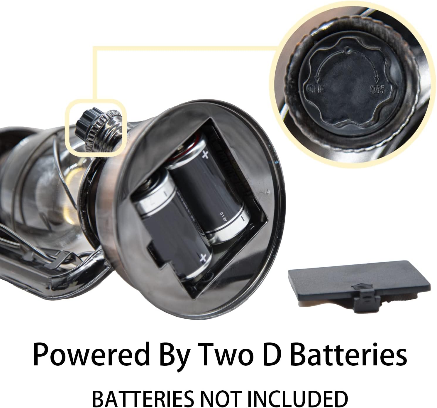 • BATTERY OPERATED: Each vintage lanterns battery powered led by 2 D batteries (not included), the battery life varies based on usage. Without wiring limited.This lantern is great useful for camping when you make your way around the campsite and your tent easily in the dark. Please note when in extreme weather conditions, the lamp should be placed indoors to prevent glass from breaking.