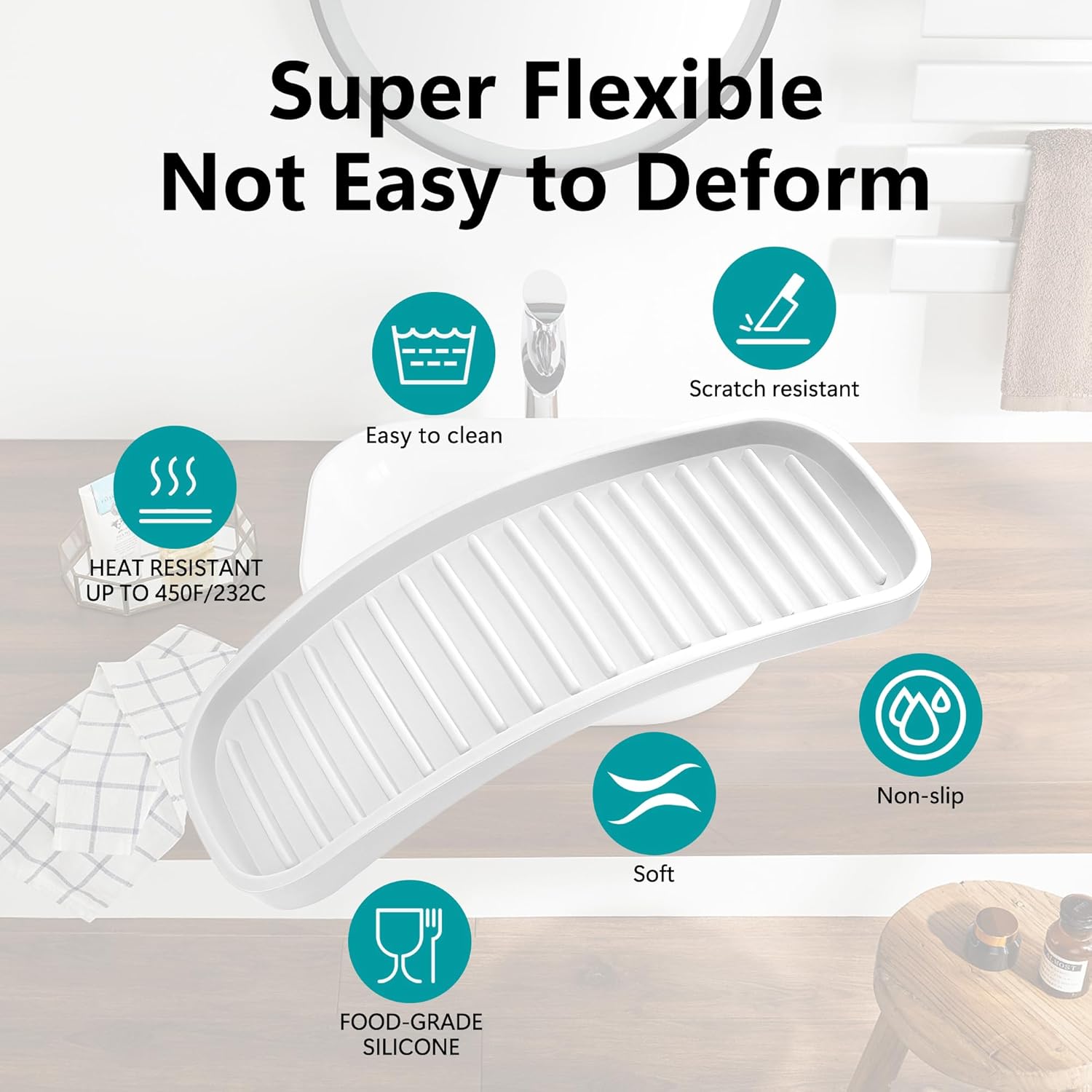 • Premium Silicone Material - Our silicone sink caddy is made of flexible silicone. This sink organizer is heat resistant up to 450F/232C, our kitchen sink organizer can be used safely with hot cooking utensils, BBQ tools or hot hair tools. Protect your counters and surfaces from heat. After use, simply wash it with a warm soapy water. Or simply toss into the dishwasher!