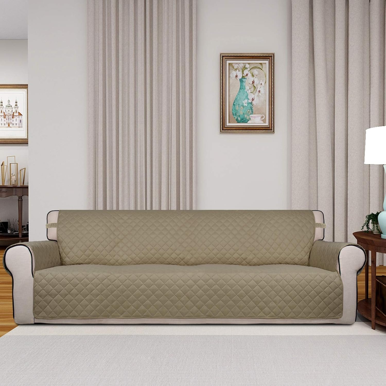 PureFit Reversible Quilted Sofa Cover, Water Resistant Slipcover Furniture Protector, Washable Couch Cover with Non Slip and Elastic Straps for Kids, Dogs, Pets (XX Large, Beige/Beige)