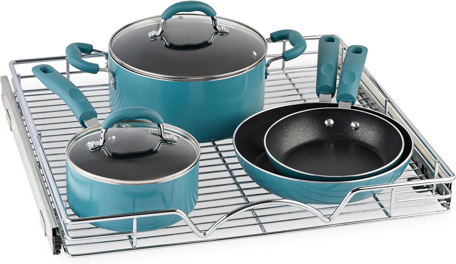 • HIGH QUALITY: Made of durable metal with chrome finish the pull out shelf for kitchen cabinet is simple and easy to install. Designed to fit any style of cabinetry and easy to clean.