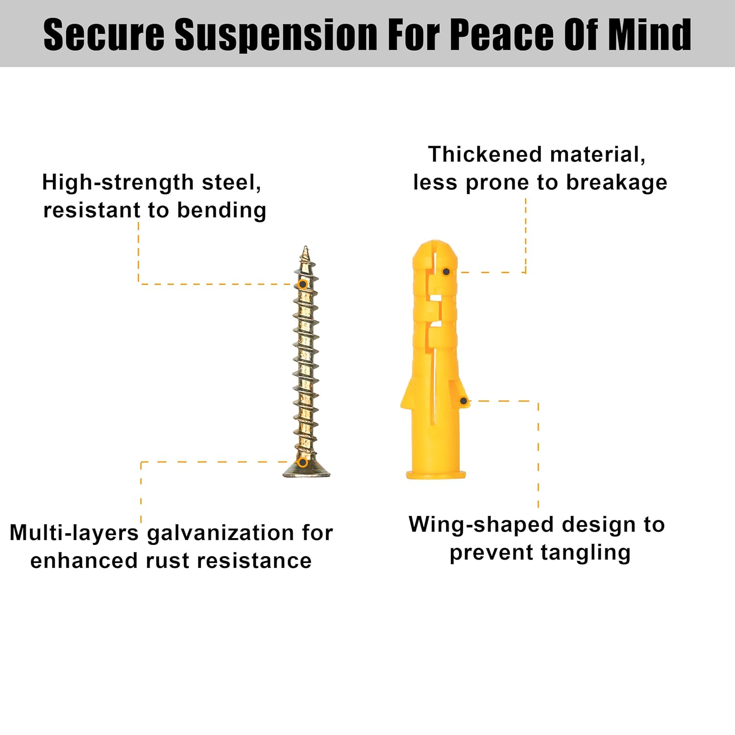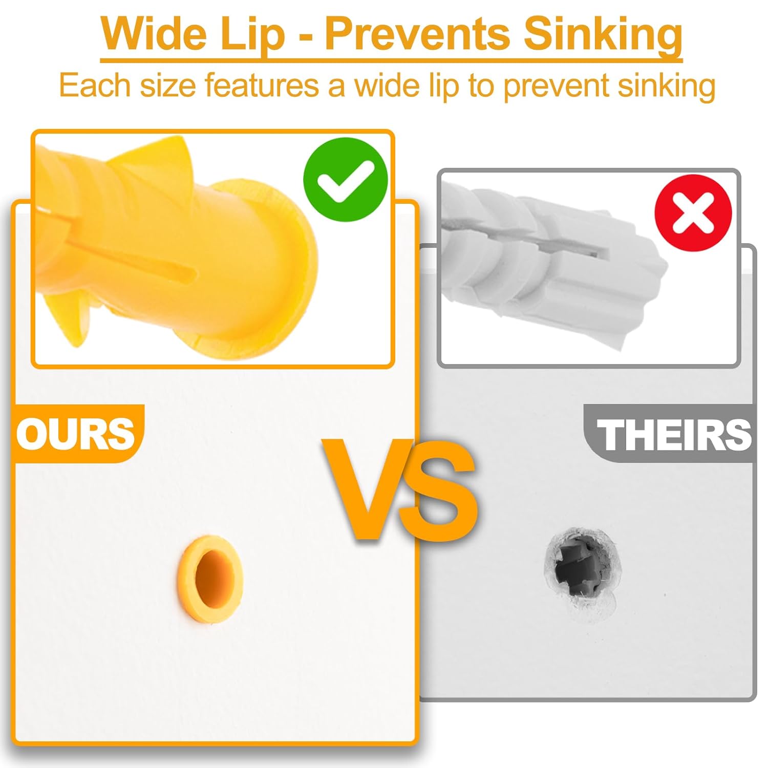 • PREMIUM MATERIALS FOR SUPERIOR DURABILITY: Our plastic wall anchors are crafted from a high-performance nylon and PE compound, providing enhanced strength, wear resistance, and long-lasting reliability. The ribbed design ensures a tight grip inside the wall, preventing slipping or loosening over time. The galvanized Phillips screws made of high-carbon steel offer outstanding hardness and resistance to rust and corrosion, making them ideal for both indoor and outdoor applications.