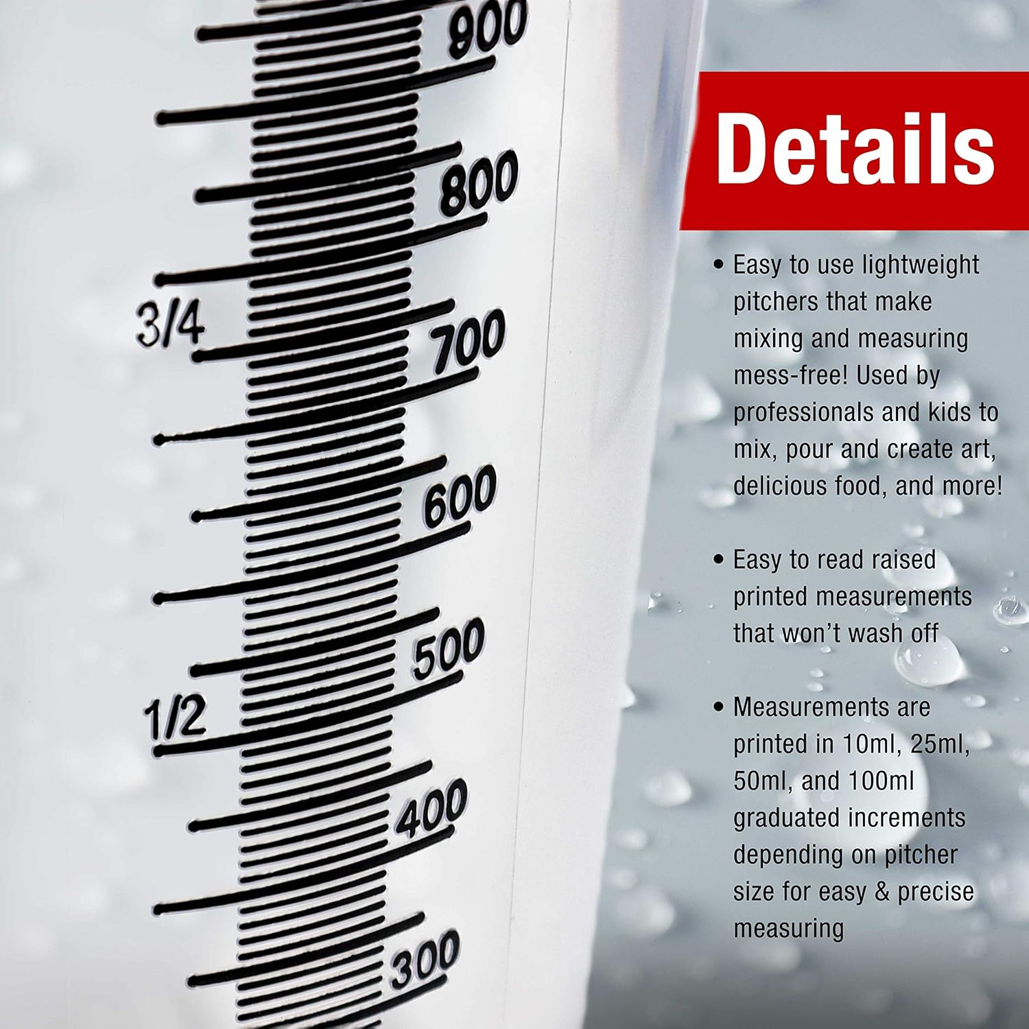 • Pack of 6 - 1 Liter (1000 ml) sturdy plastic measuring and mixing cup pitchers. Each pitcher holds over 1 quart (32 Ounces) with a 40 fluid ounce capacity. The pitcher's stack and store easily because of the spout design and the open handles.