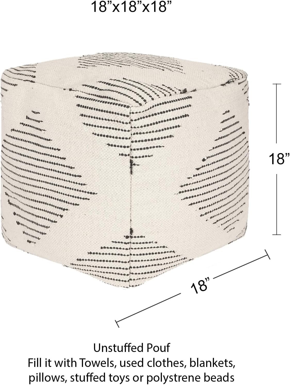 • HANDMADE FROM THE FINEST MATERIALS: The material of this eye-catching UNSTUFFED farmhouse pouf cover is made from 100% cotton. Each textured floor cube pouf ottoman cover measures 16"x16"x16" before stuffing and expands to 18"x18"x18" after stuffing. This is a decorative cover only and requires stuffing or filling. The foot stool can be filled with sheets, blankets, towels, used clothes, pillows, polystyrene beads as per convenience. it's a great way to reduce clutter or store seasonal products!