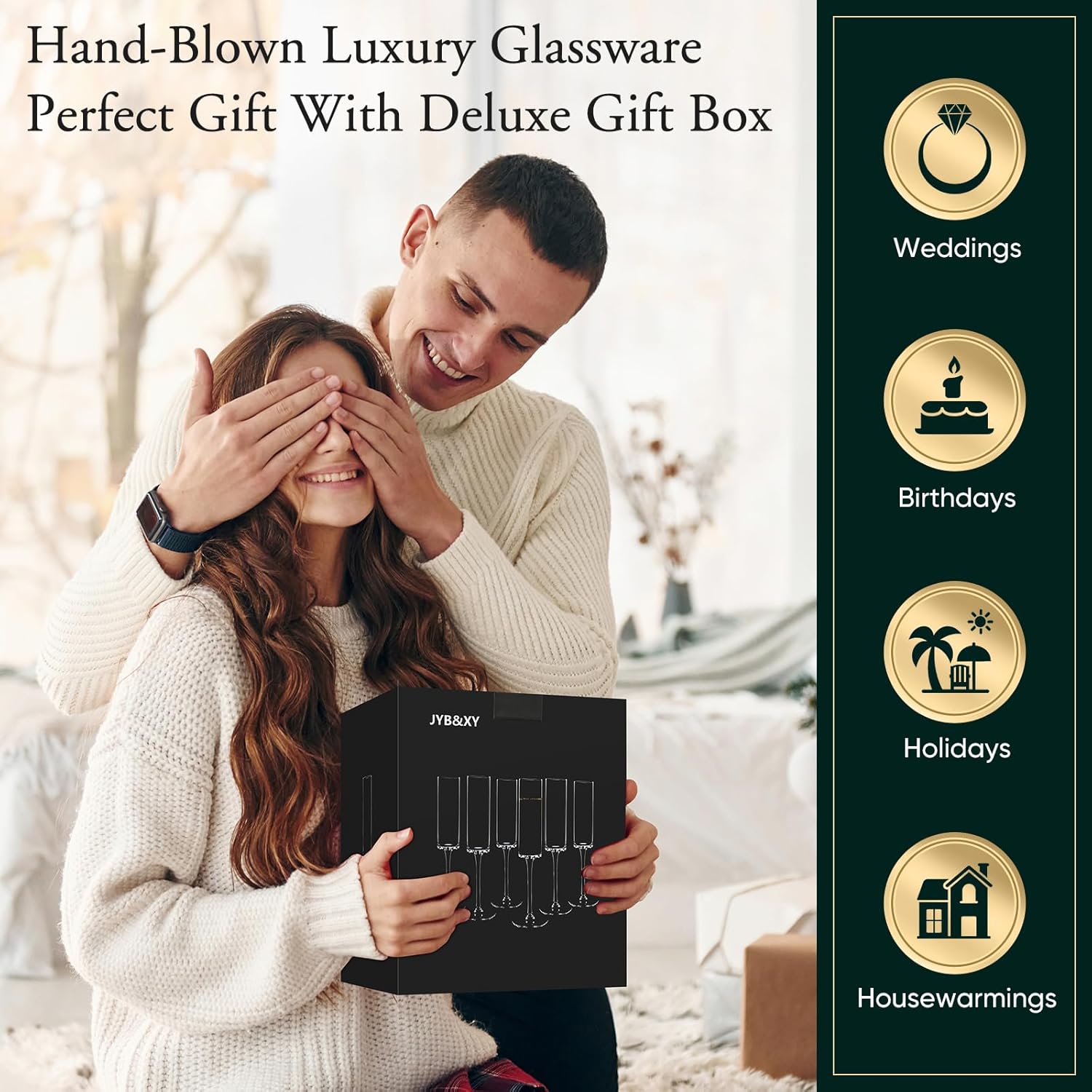 JYB&XY Champagne Flutes Set of 6 Hand Blown Elegant Champagne Glasses With Long Stem Elegant Sparkling Wine Stemware 6.5oz- for Women, Men, Wedding, Anniversary, Christmas, Birthday,Parties