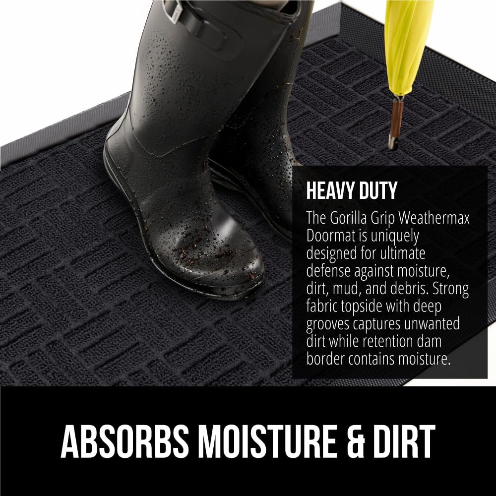 • THE ORIGINAL WEATHERMAX ALL SEASON DOORMAT: Gorilla Grip's Original WeatherMax doormat is built tough with a heavy duty, yet soft and flexible construction; deep grooves, beveled rubber border and retention dam help capture dirt, debris and moisture