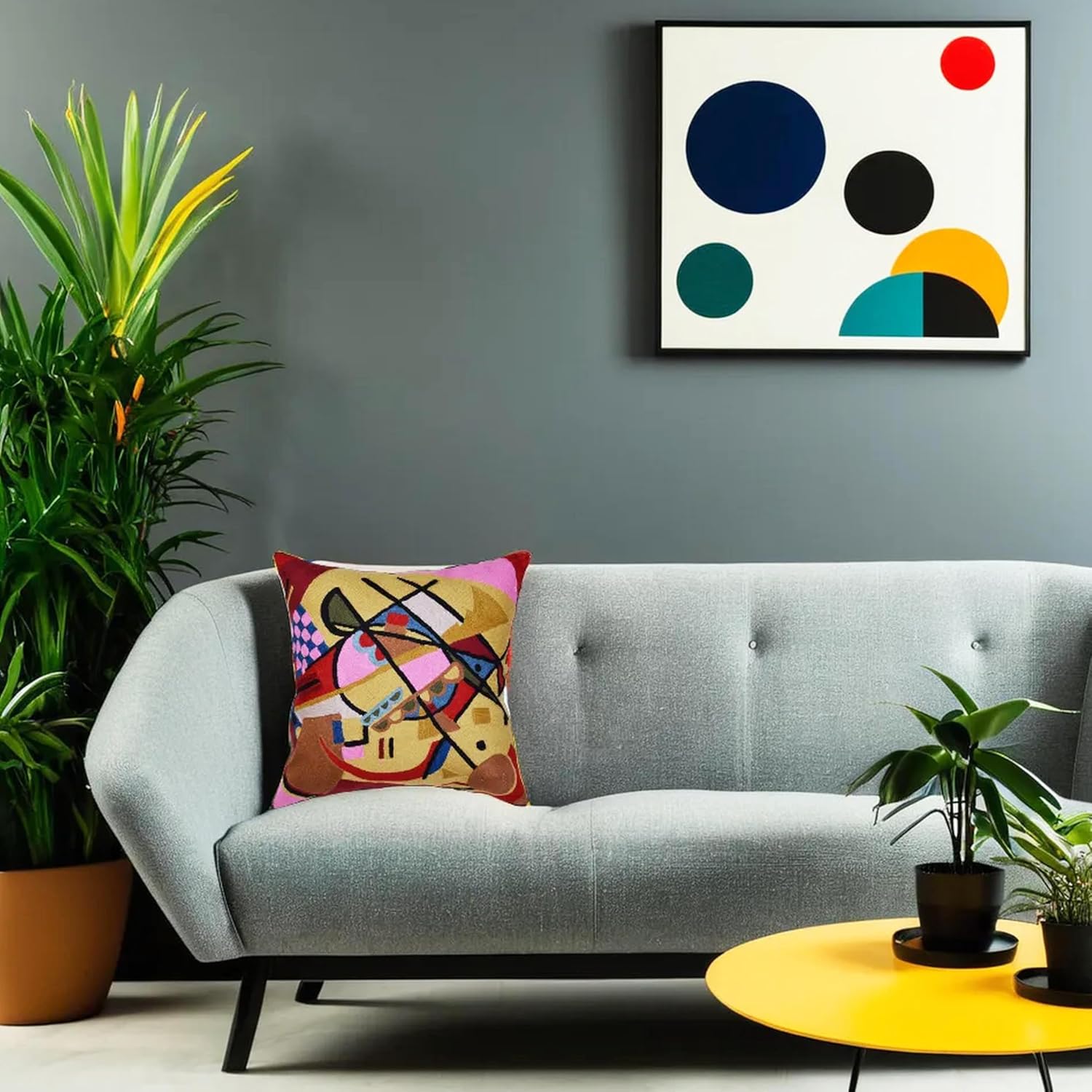 • ๐Ÿ‘ PREMIUM NATURAL MATERIALS: Our soft all modern decorative pillows are made of premium organic natural materials. Front - Hand embroidery: 100% Soft Wool, Backing: 100% Cotton Canvas. This needlework embroiderd accent pillow can be used as a mid century modern pillow or as a modern farmhouse pillowcase. Our unique Kandinsky inspired abstract pillows are truly hand embroidered, breathable, soft and comfortable, and easy to care.