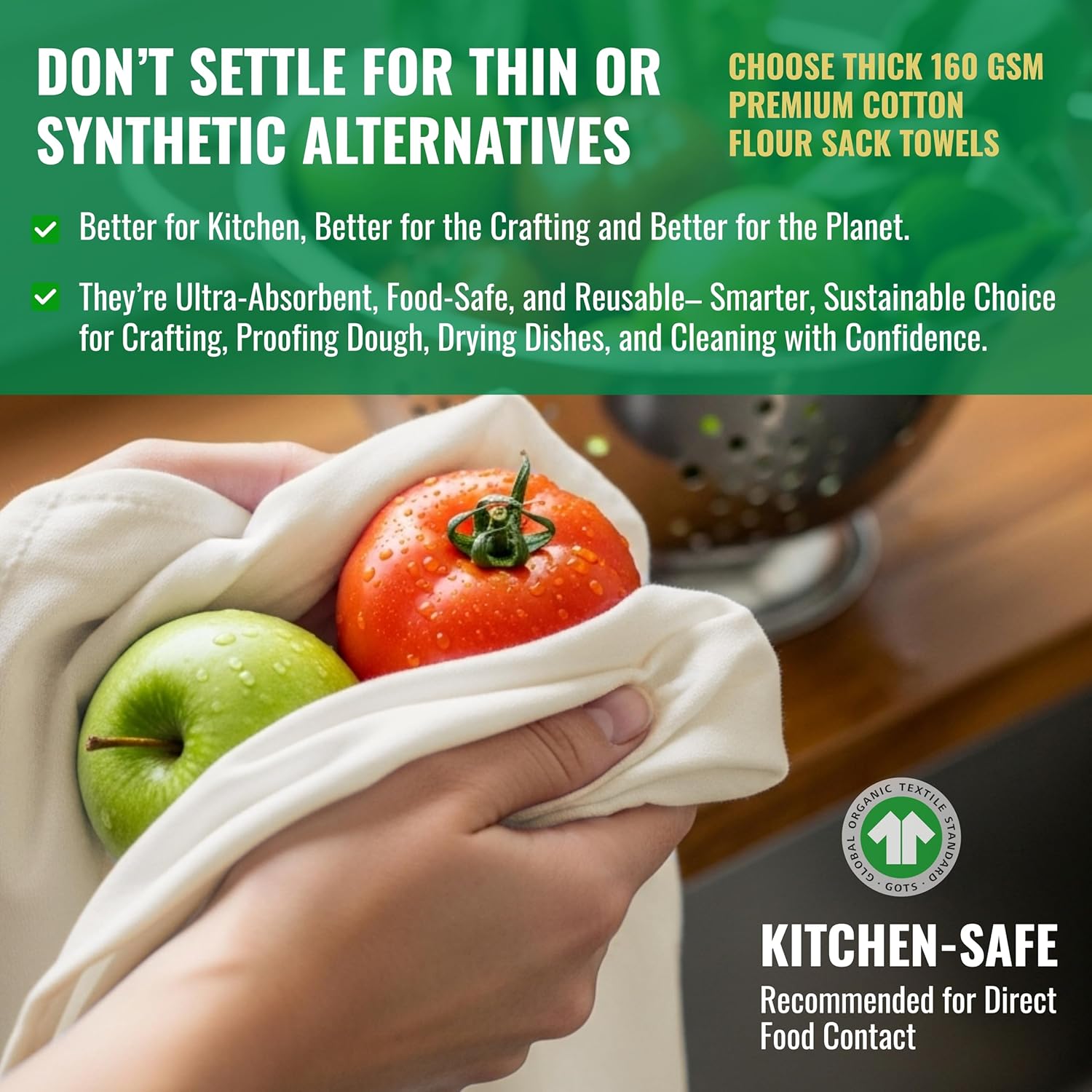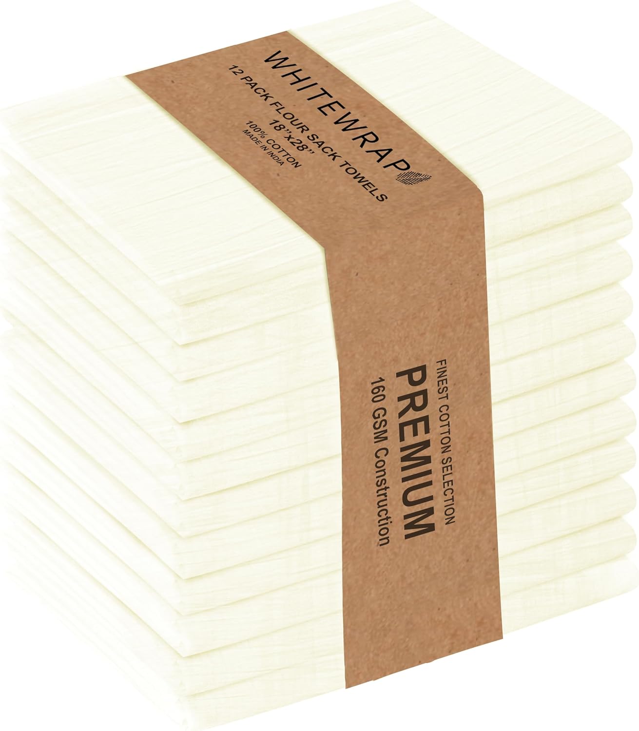 • ✅ Ultra-Thick 160 GSM Flour Sack Towels – Kitchen-Grade Absorbency Tired of thin, ineffective towels? WHITEWRAP’s high-density 160 GSM flour sack towels, made from 100% ring-spun cotton with a 130 thread count, offer exceptional thickness and ideal for drying dishes, wiping, and tough kitchen tasks.