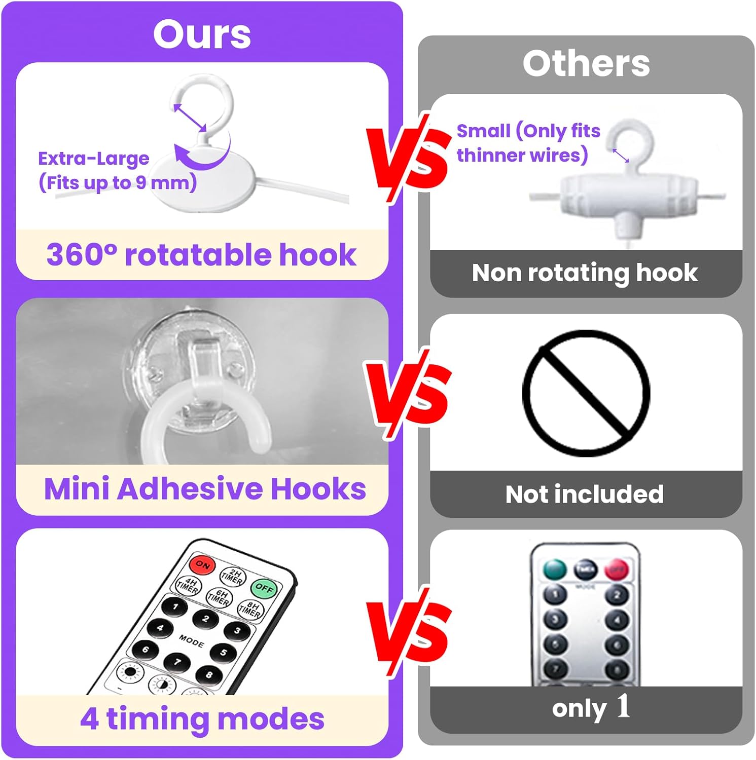 • 【360° Rotatable hooks】: Upgrade 360° Rotation Clips on each drop string is mainly used for hooking on curtains. It can be hung at any angle, such as on wall, window or other surface. Also includes 16 sets of Damage-free adhesive hooks. No nails needed and holds strongly & removes cleanly. Both of these two clips make the curtain light easily to be hung for some special places, not only limited to windows, but also can be hung on flat walls, glass, porches, eaves, etc.