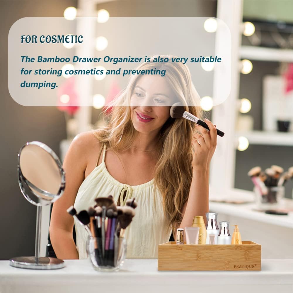 • PRACTICAL STORAGE SPACE:PRATIQUE drawer organizer can reduce clutter and avoid desperately searching for lost items. Ensure drawers in the kitchen and beyond are neat and organized.The flatware organizer is made of bamboo, which has a neutral light wood color and it will look beautiful as your kitchen, closet, garage and office drawer.
