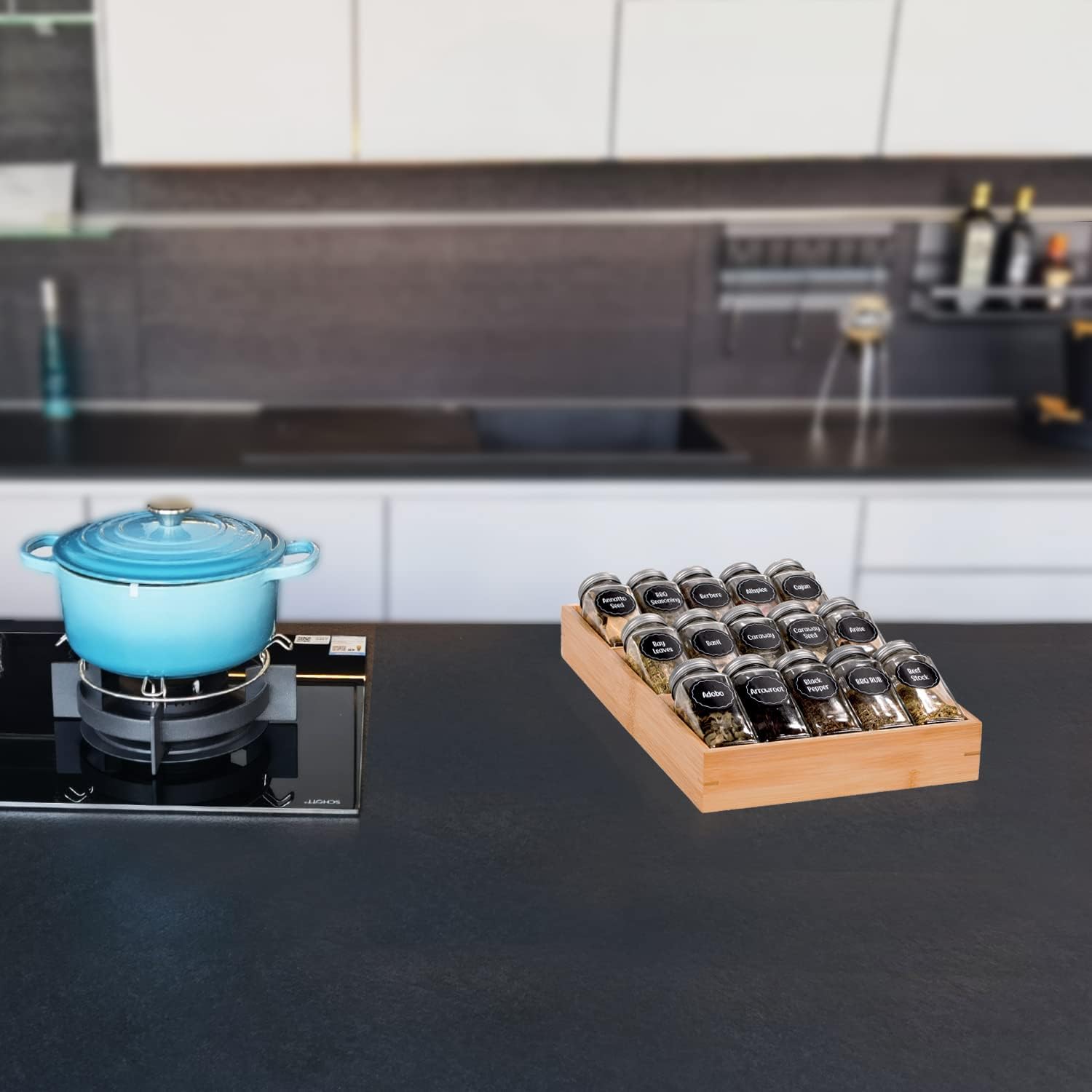 • ⚠Please Measure Your Drawer Size Before Purchasing: The size of this spice rack is: 15 x 9.7 x 2 inches. Fits more than 4 inch deep drawers. Please note: When measuring the drawer size, the internal dimensions should be measured and the interference of the drawer slides and handles should be excluded. ❗❗(Spice Jars Not Included)