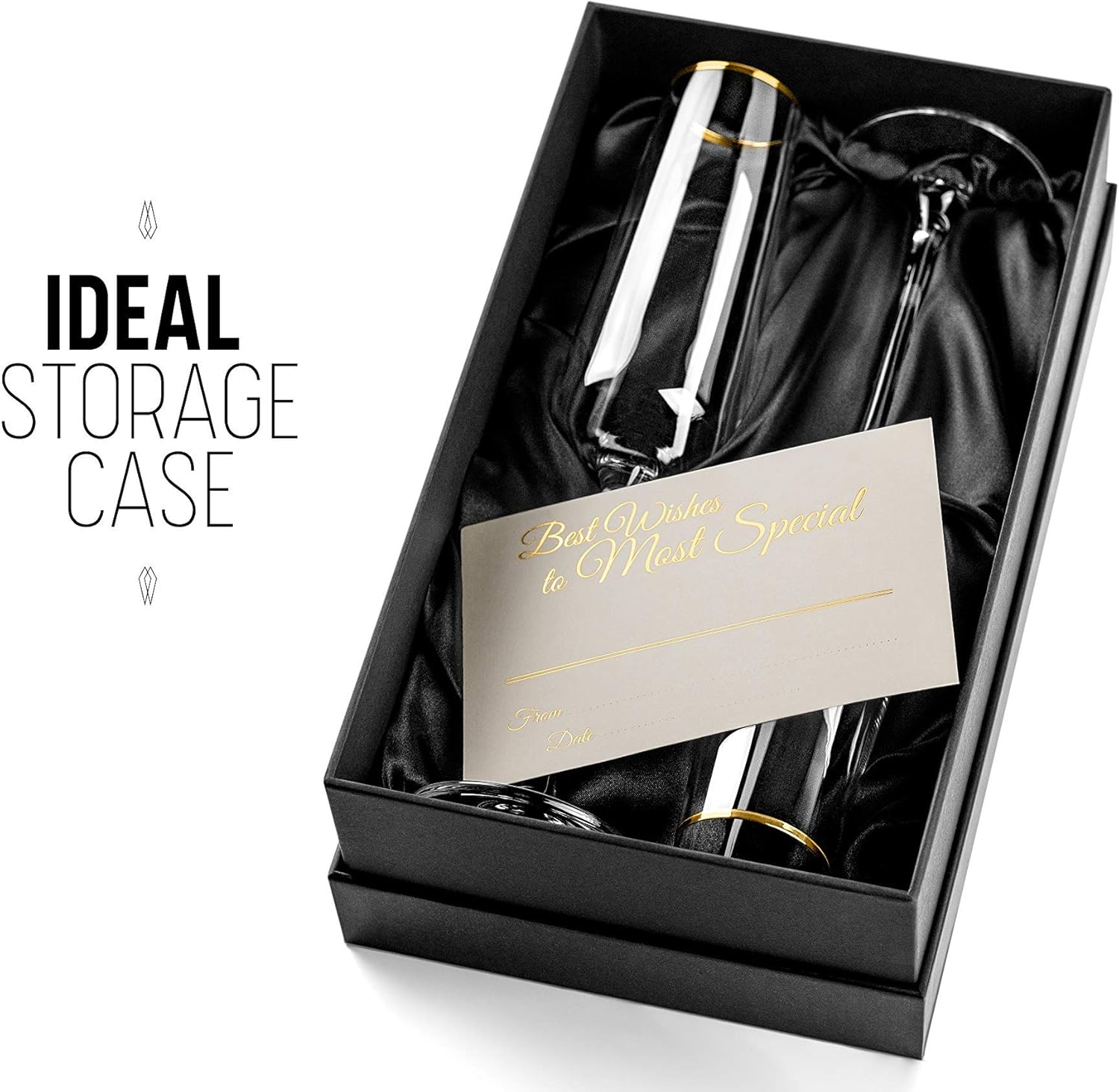 • EXQUISITE TOASTING FLUTES – if you are looking for an extraordinary pair of champagne glasses to toast one of the life’s special moments such as engagement, wedding, anniversary, graduation or big birthday these crystal flutes will surely add a golden sparkle to the beautiful toasting experience and future celebrations.