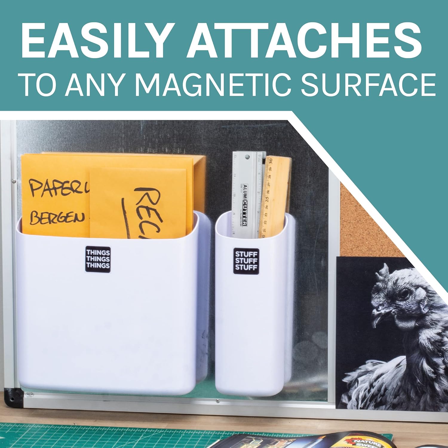 • No need to worry about the bins sliding down your washer, dryer, or refrigerator. The large powerful magnets measure 6.25 x 5.5 in. on the large bin and 5.375 x 2 in. on the small bin.