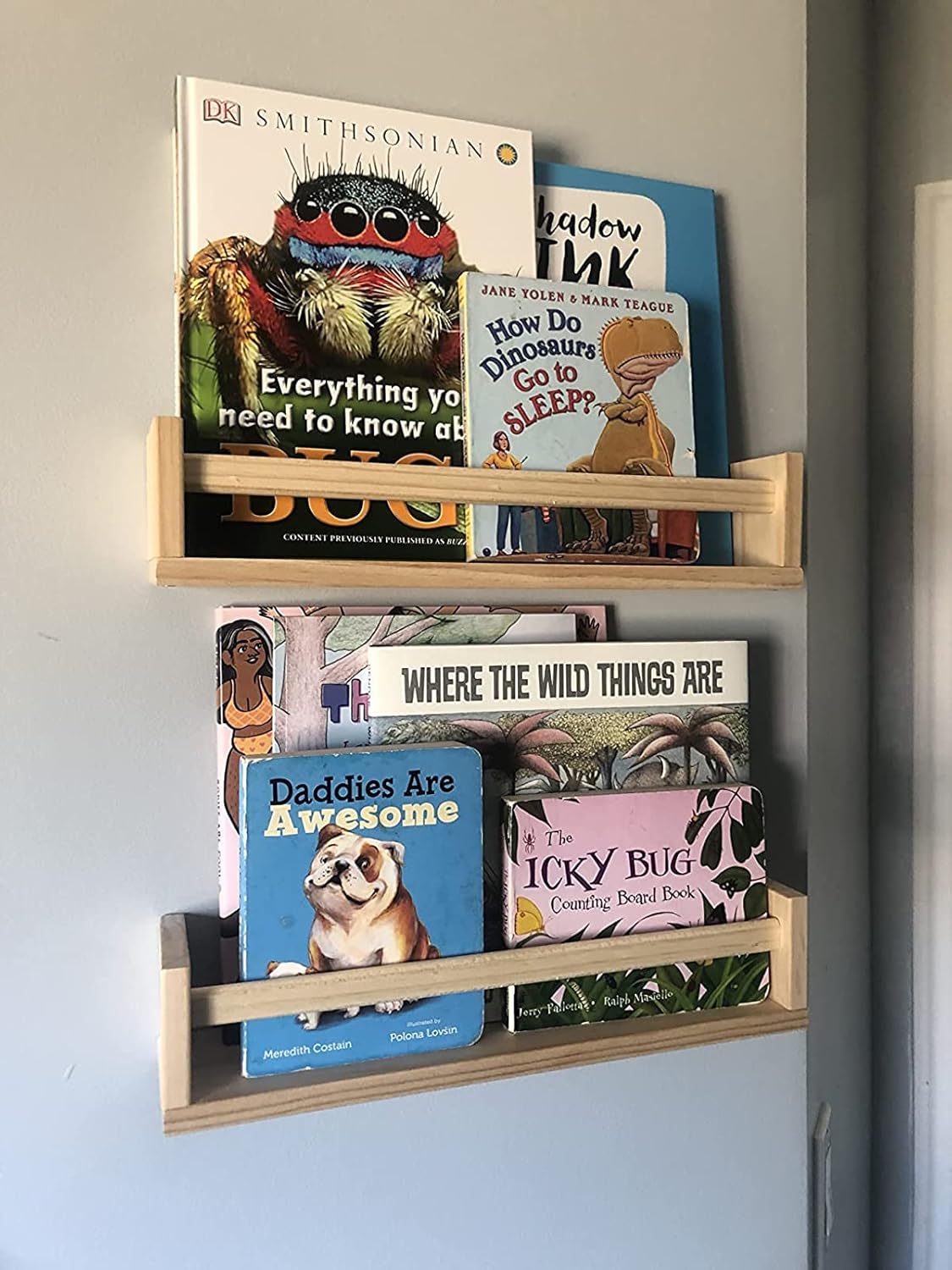• ♻️SOLID STORAGE – The nursery bookshelf made of high quality pine wood , this hard floating shelving is sturdy and dependable. These shelves can hold a whole row of books, toys and stuffed animals with no issue! The floating bookshelf are designed with style and functionality in mind. Great for bedrooms, kitchens, and bathrooms!