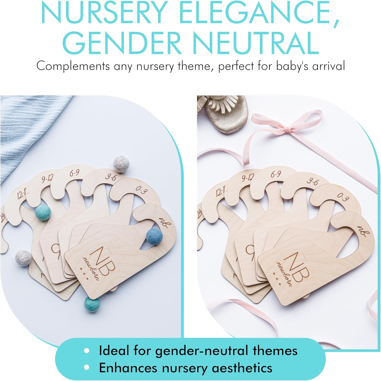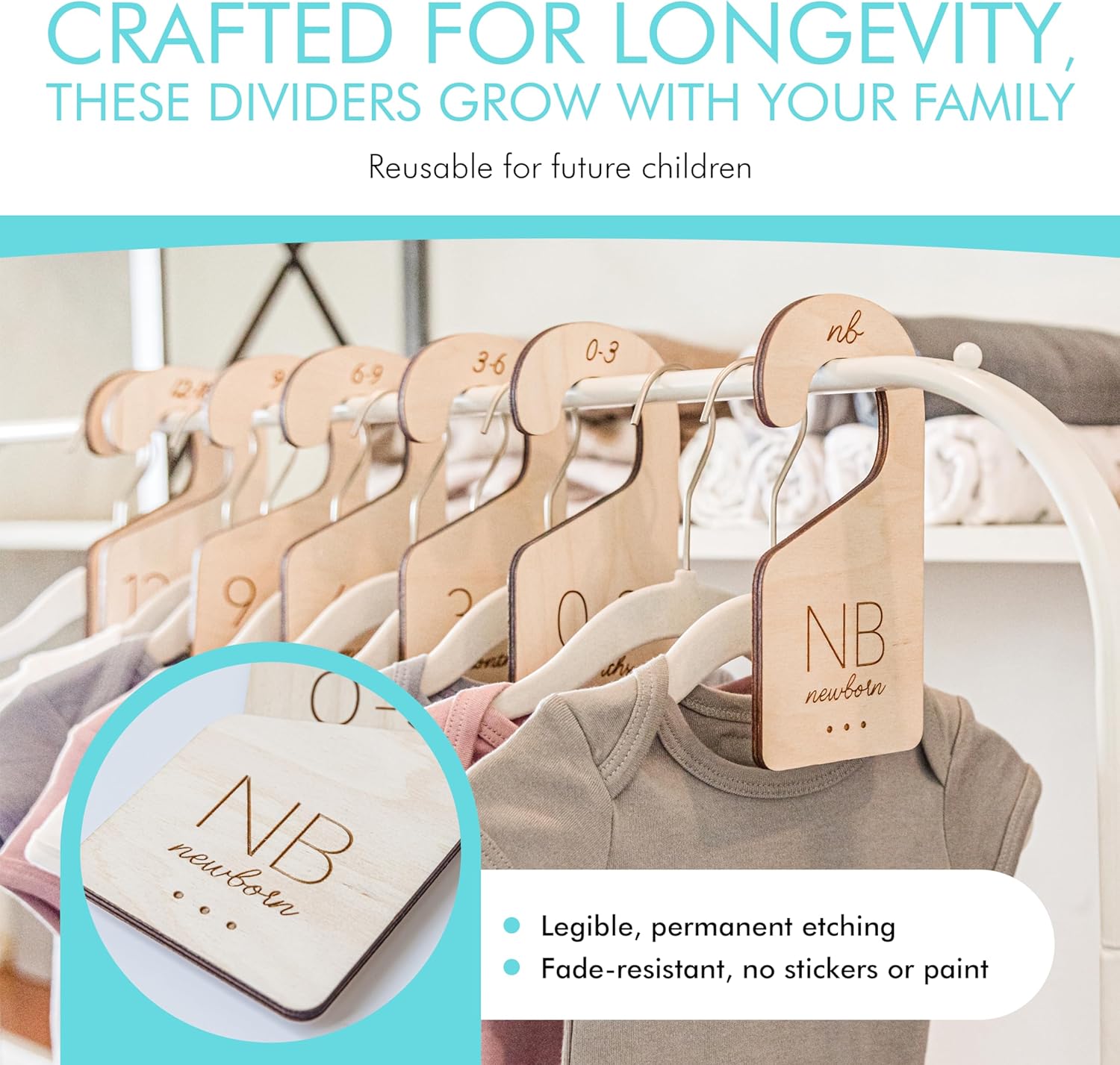 • ORGANIZATION MADE EASY - Organizing your baby's wardrobe is a BREEZE with our baby clothes dividers for closet that cover sizes from newborn to 18-24 months, so you can always sort and arrange baby clothes in order with wooden baby hangers.