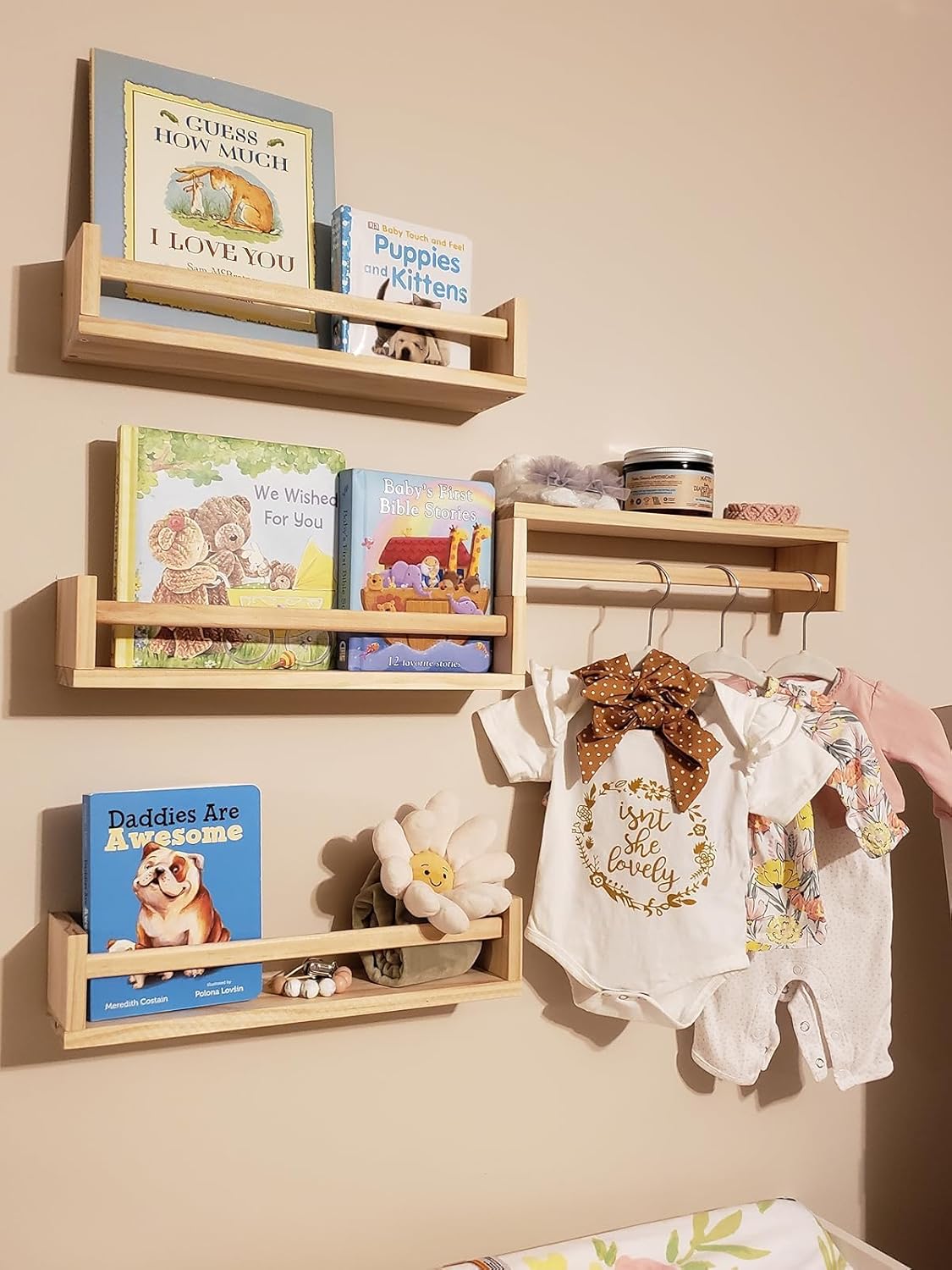 • ✅STURDY CONSTRUCTION – Organize your childrens books, toys, small picture frames, and other decorative pieces with this Nursery Room Wall Shelf Set. It is made with a sturdy, solid wood and has an understated yet functional design that is great for bedrooms, kitchens, and bathrooms