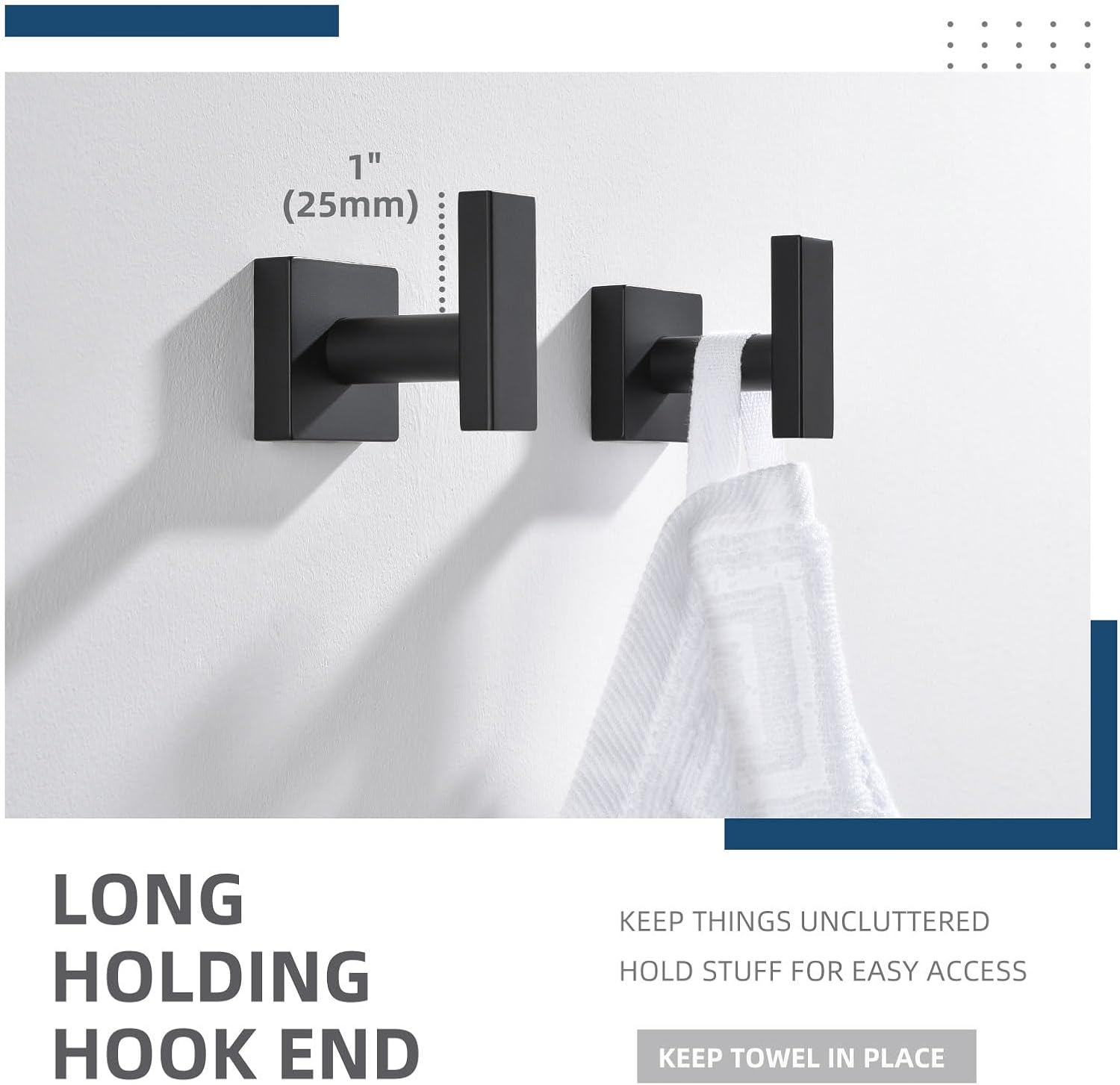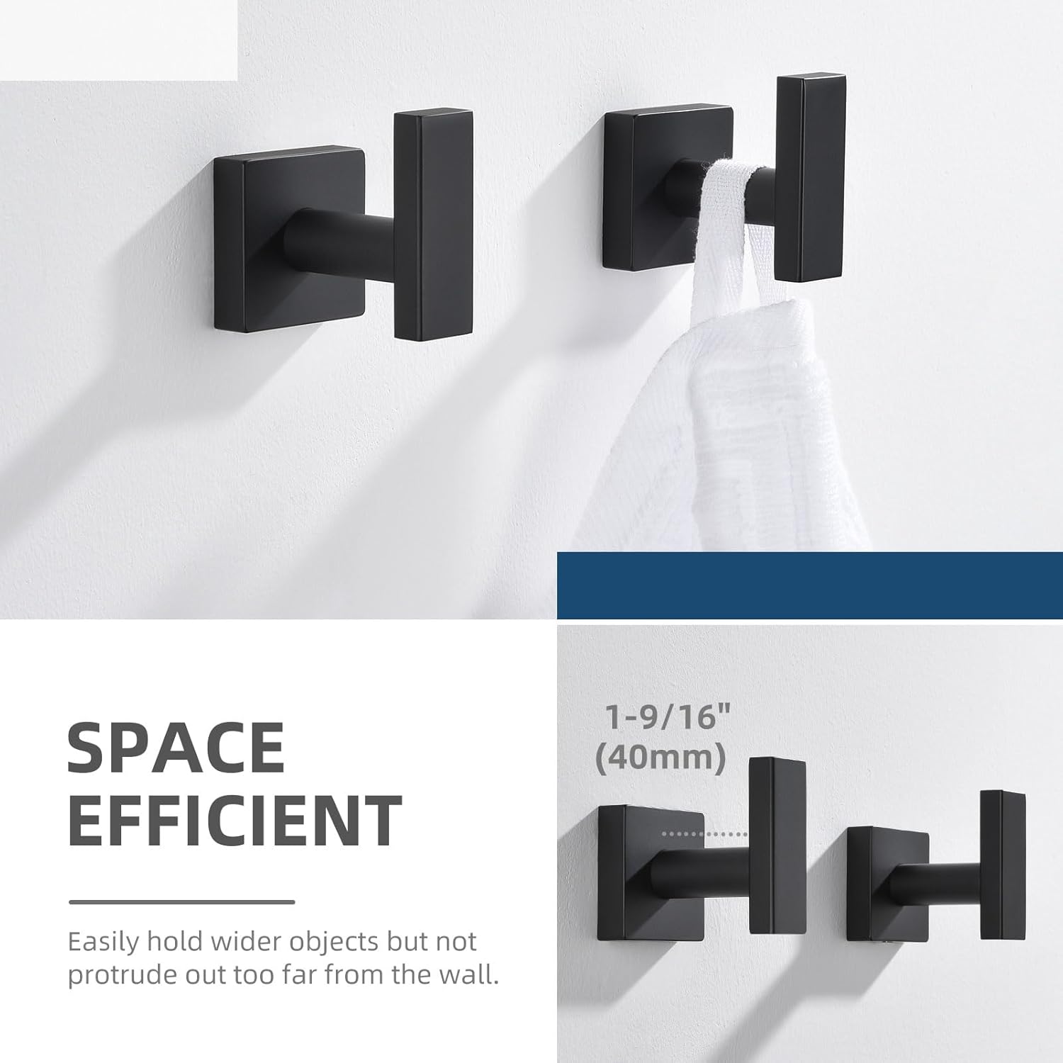 • QUICK DRYING & FIRM MOUNTING: leaves space for drying out towels but not protrude out too far from the wall, secure with no wobble under proper installation, dimension (L*D*H): 1-3/4" x 2-3/8" x 2-1/4"