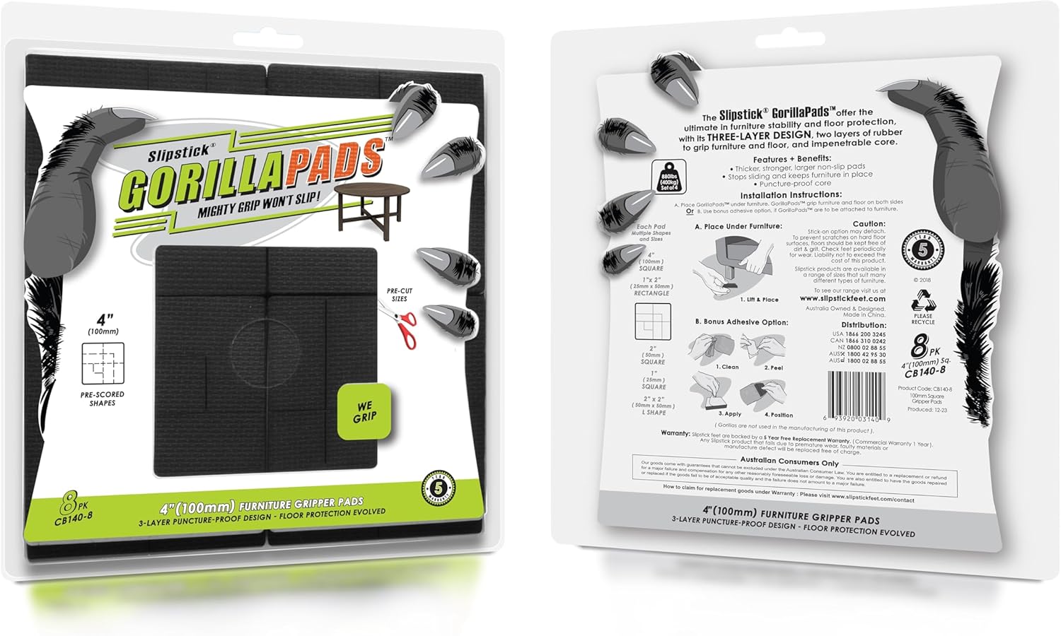 • Mighty grip that won’t slip – GorillaPad furniture grippers by Slipstick are the universal solution to stop unwanted movement or sliding of furniture / objects and effectively protect hard surfaces from scratches or damage. Includes 8 x 4 inch non slip furniture pads.