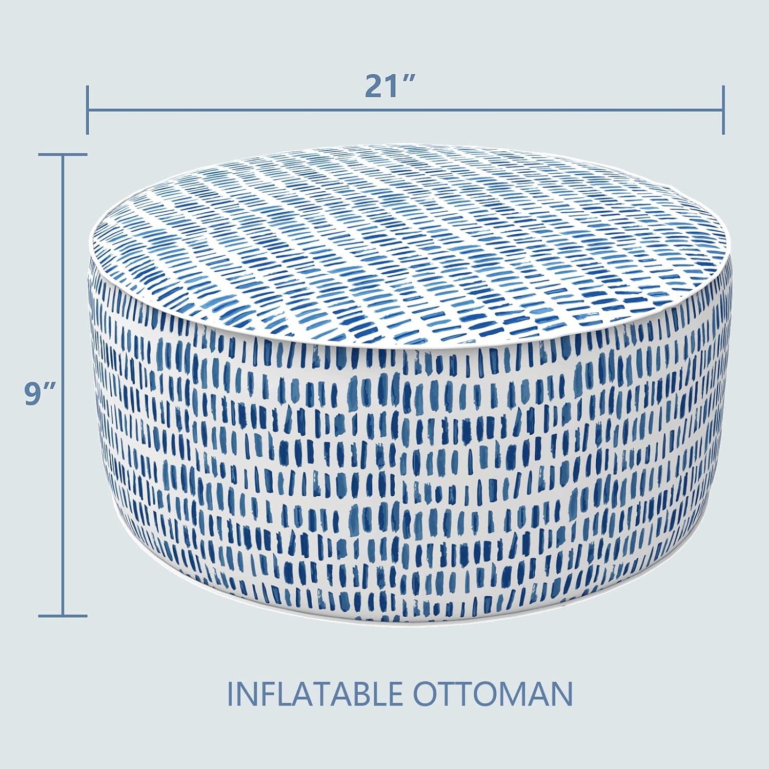 • COMPONENTS: This value bundle come with 1 pcs indoor outdoor inflatable ottoman measures D21” x W21" x H9” (53 x 53 x 23cm). Made of durable and soft polyester fabric, sturdy inflatable PVC liners. INFLATOR IS NOT INCLUDED.