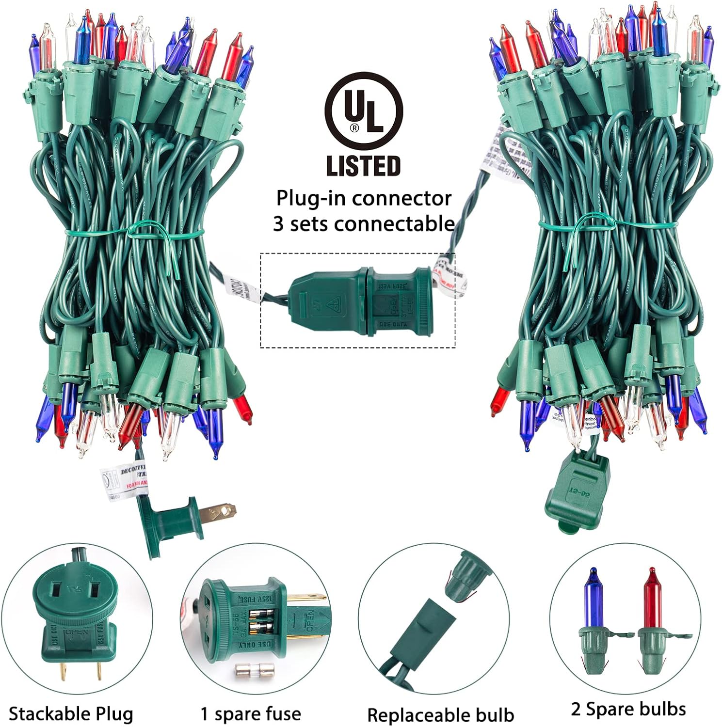 • Creative Patriotic Decorations: This Independence Day Decorations light on green wire set includes 200 incandescent mini bulbs. The total length is 51.7 feet, each bulb is 3 inches apart, 20 inches lead wire, 3 inches end connector. It can be connected end to end to meet your decoration needs, up to 3 creative light strings