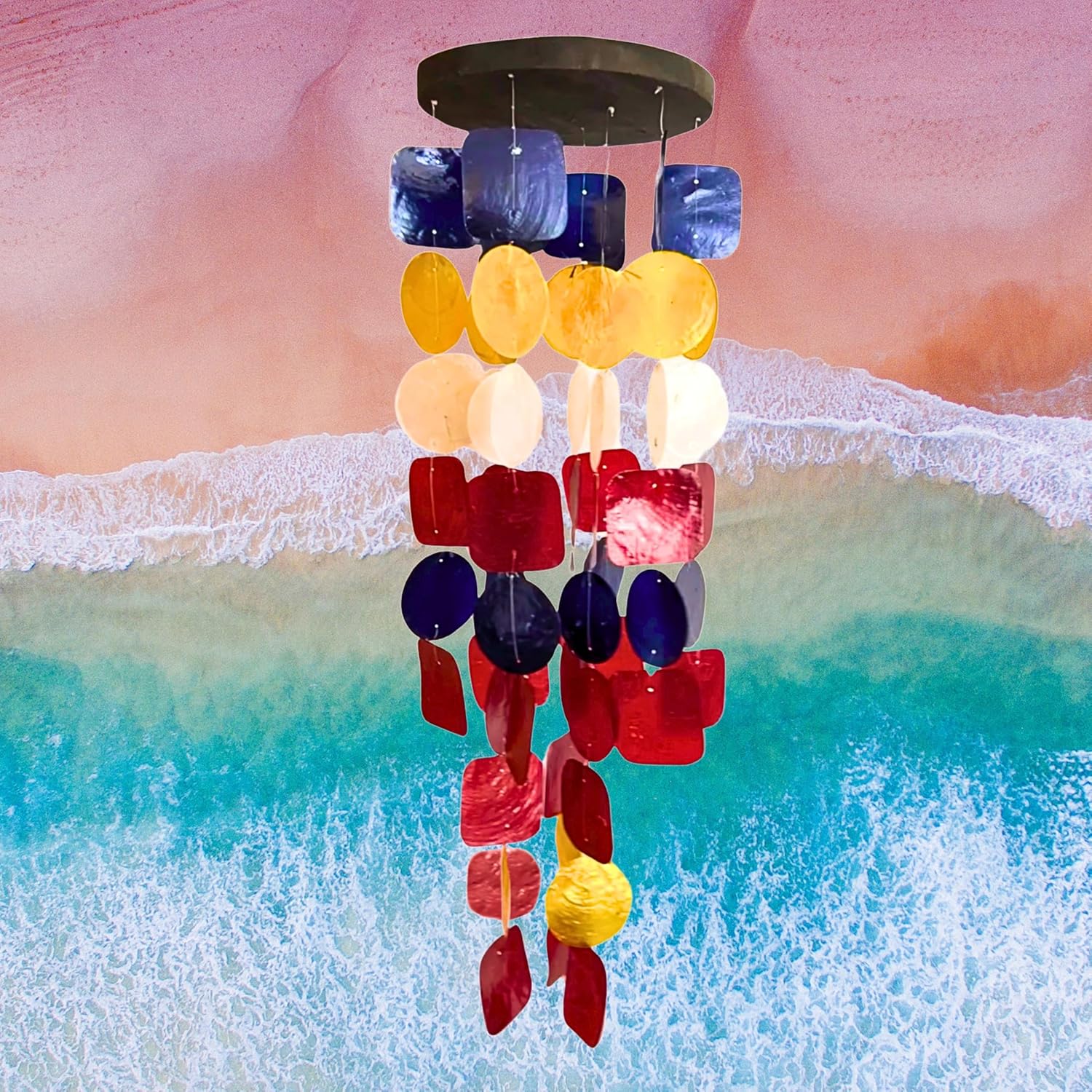 • Unique Wind Chimes: Our colorful outdoor windchimes are strong and long lasting, composed of natural capiz seashells glass, and wood, measuring 27 inches in length.