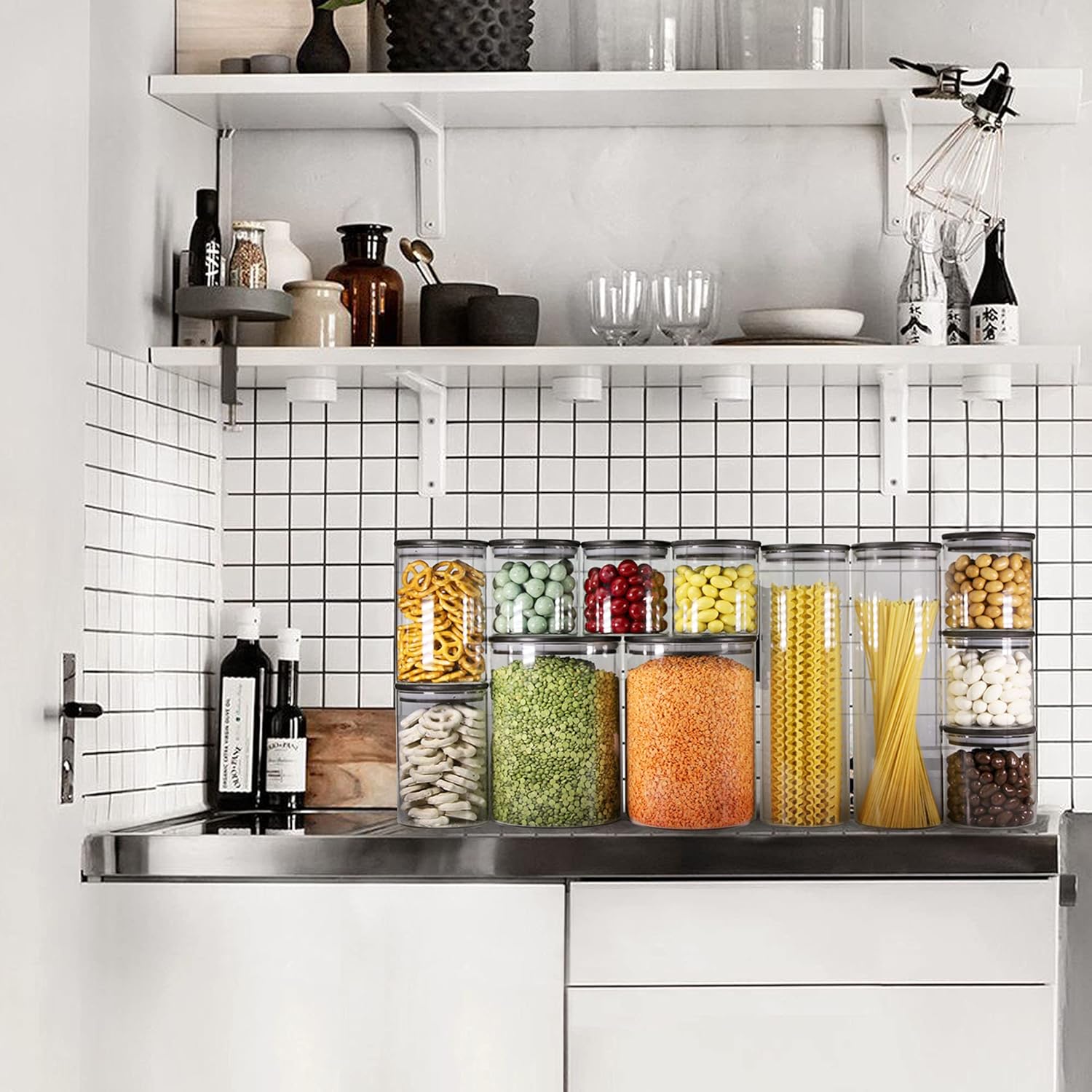 • ✅ 2021 NEW STYLISH BLACK LID: Looking for black and white, cool and stylish home deco? These Urban Green glass food storage canister sets with black lids are perfect for contemporary pantry design. We carefully selected 5 different sizes from 6oz to 100oz that can store any dry food, such as pasta, beans, nuts, cookies, spice or flour. Try our black lids glass jars for a new modern pantry organization.