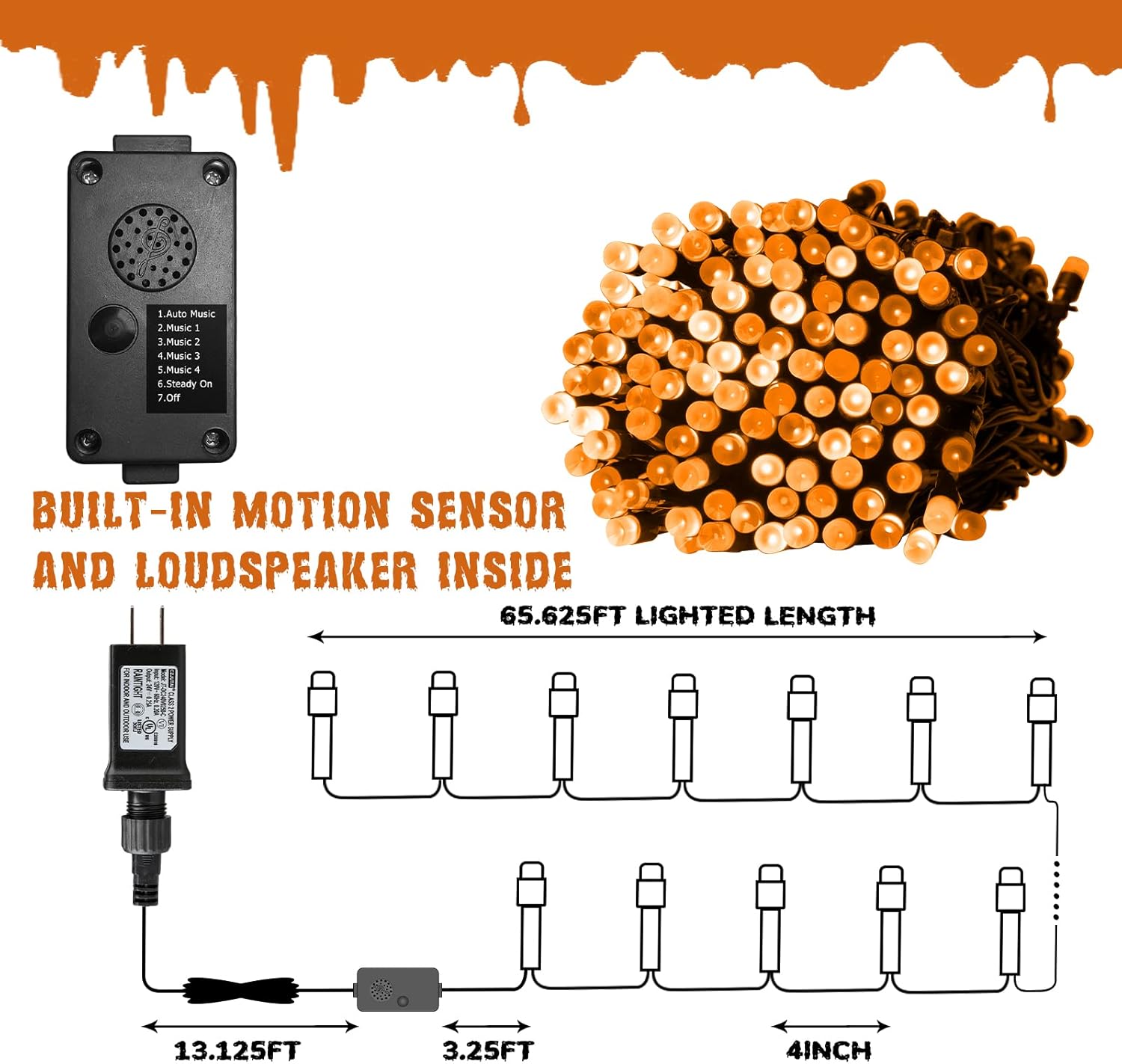 PEIDUO Halloween Lights, 82 FT 200 LED Orange String Lights, Motion Sensor Halloween Decorations, Twinkle Fairy Lights with Spooky Music for Outdoor Decor, Party Yard Indoor Outside Decoration