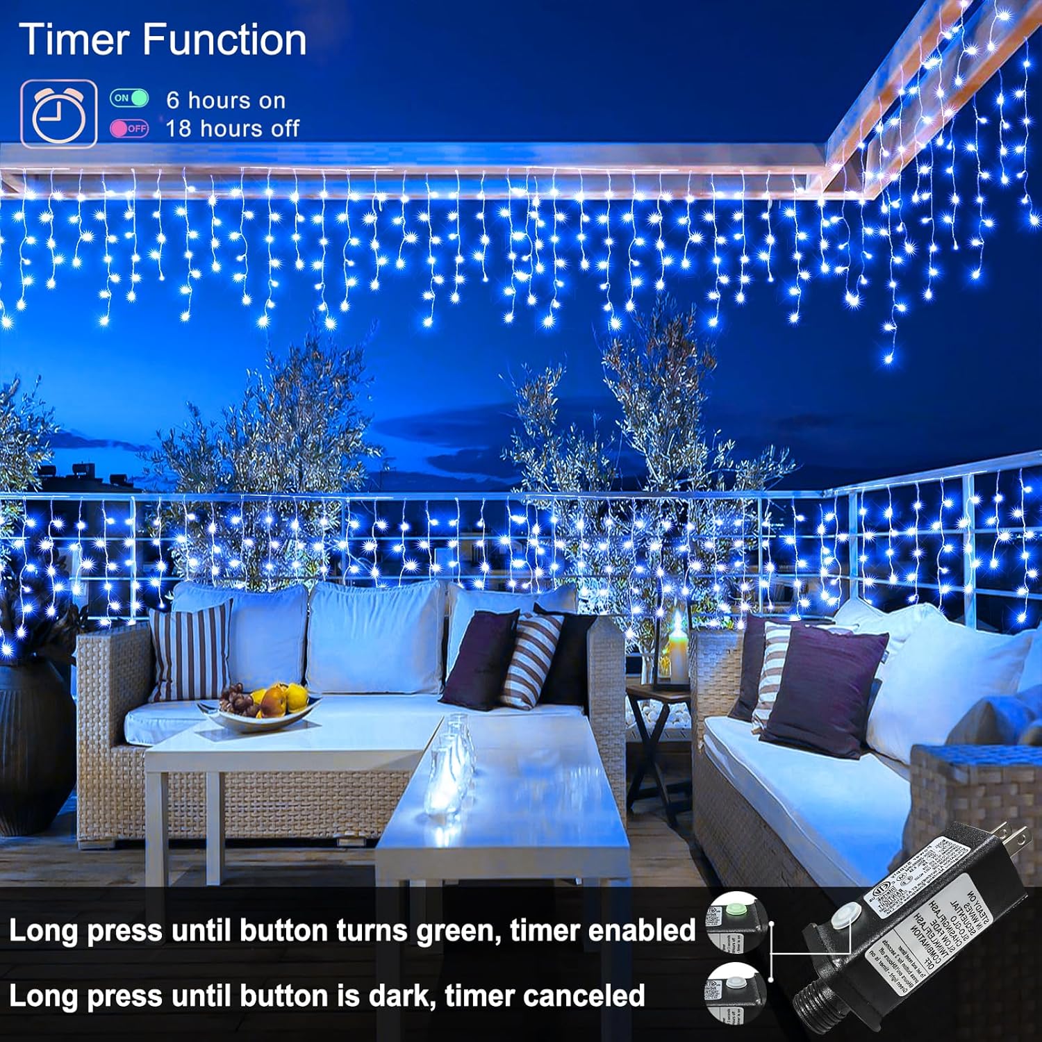 • Upgraded 8 Modes Blue Christmas Lights: The icicle lights for outside have 8 selections of light pattern: 1.Combination 2.In Waves 3.Sequential 4.Slo-Glo 5.Chasing/Flash 6.Slow Fade 7.Twinkle/Flash 8.Steady On. Different lighting effects are controlled by the button on the plug. These beautiful and vibrant led christmas lights outdoor will bring you a lot of festive atmosphere.