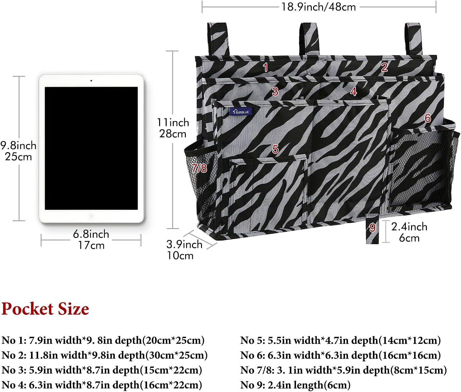 Surblue Bedside Caddy Hanging Organizer Storage Bag Pocket for Bunk, Hospital, College Dorm Rooms, Baby Bed Rails, Camp - 8 Pockets (Large, Zebra)