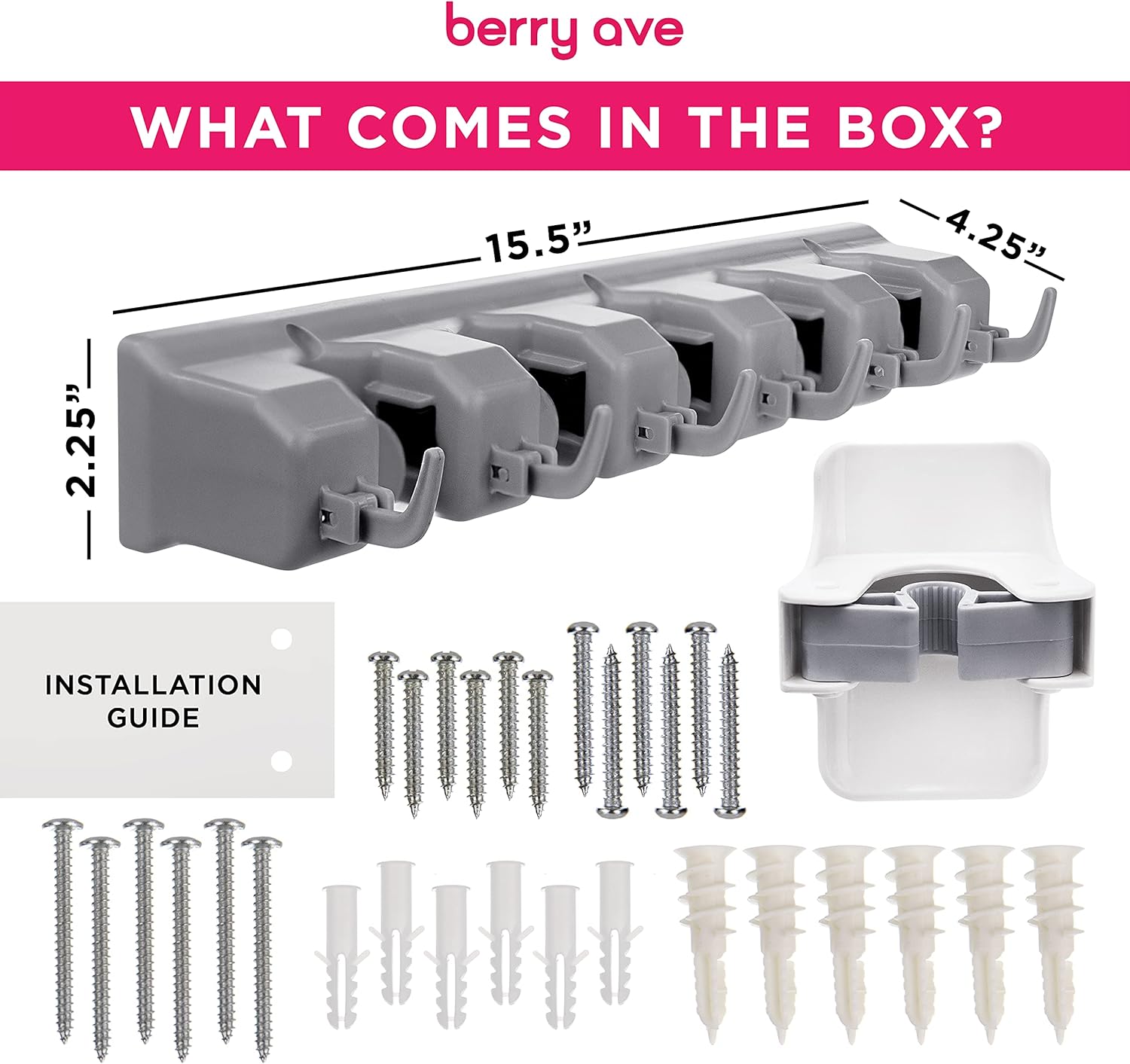 Combo 5 Slot Broom Holder w/ 1 Self Adhesive Mop Gripper No-Drilling, Wall Mount Tool Organizers For Kitchen, Garage, Laundry Room- Anti-Slip Hanger For Brooms, Mops, Rakes, Dustpans (Grey / White)