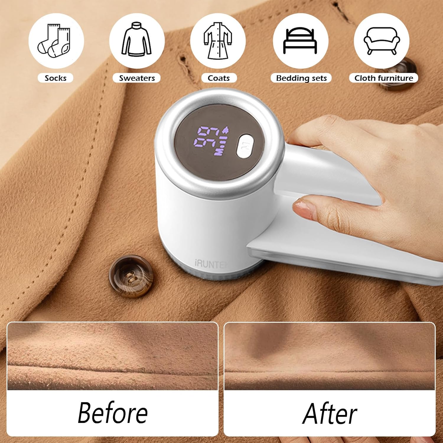 • ✅ LED DIGITAL DISPLAY: Fabric shaver using high-tech LED display, can be seen clearly of the battery power and speed gear on the screen, when the digital dispaly below 10, it need recharged, convenient and intuitive (Tips: Charging with 5V/1A adapter head)