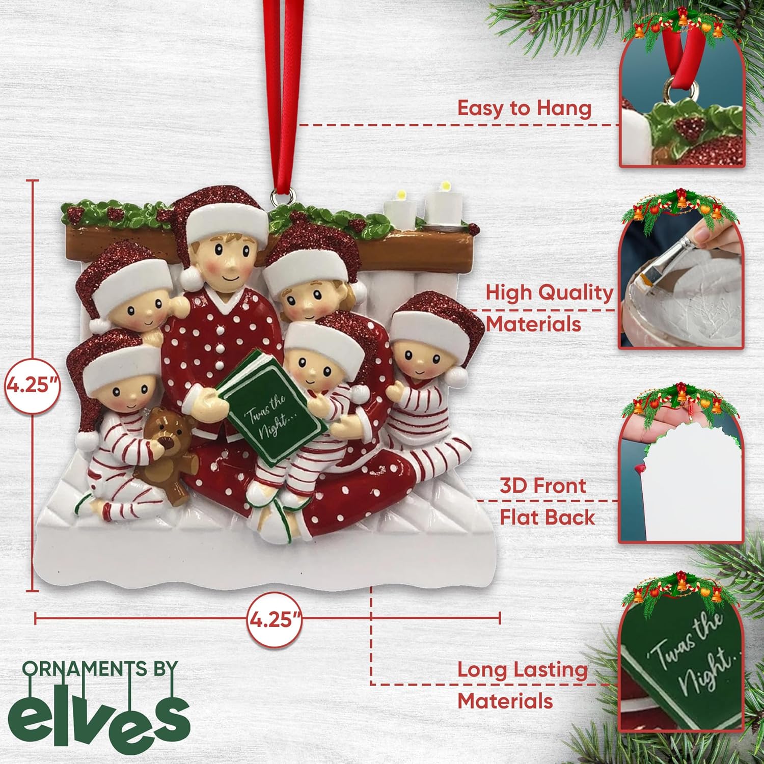 • 🎁 Celebrate Your Family of 6: Mark a joyful milestone with a personalized family of 6 Christmas ornament 2025. Whether it’s your first year as six or part of a cherished tradition, this keepsake honors your growing bond and tells your story with warmth, love, and festive cheer. This bedtime Christmas story ornament captures a magical moment with a family of six in striped pajamas, all wearing glittery red Santa hats. They’re cozied up while holding ’Twas the Night… book, surrounded by soft details like a teddy bear and holiday candles for extra warmth.