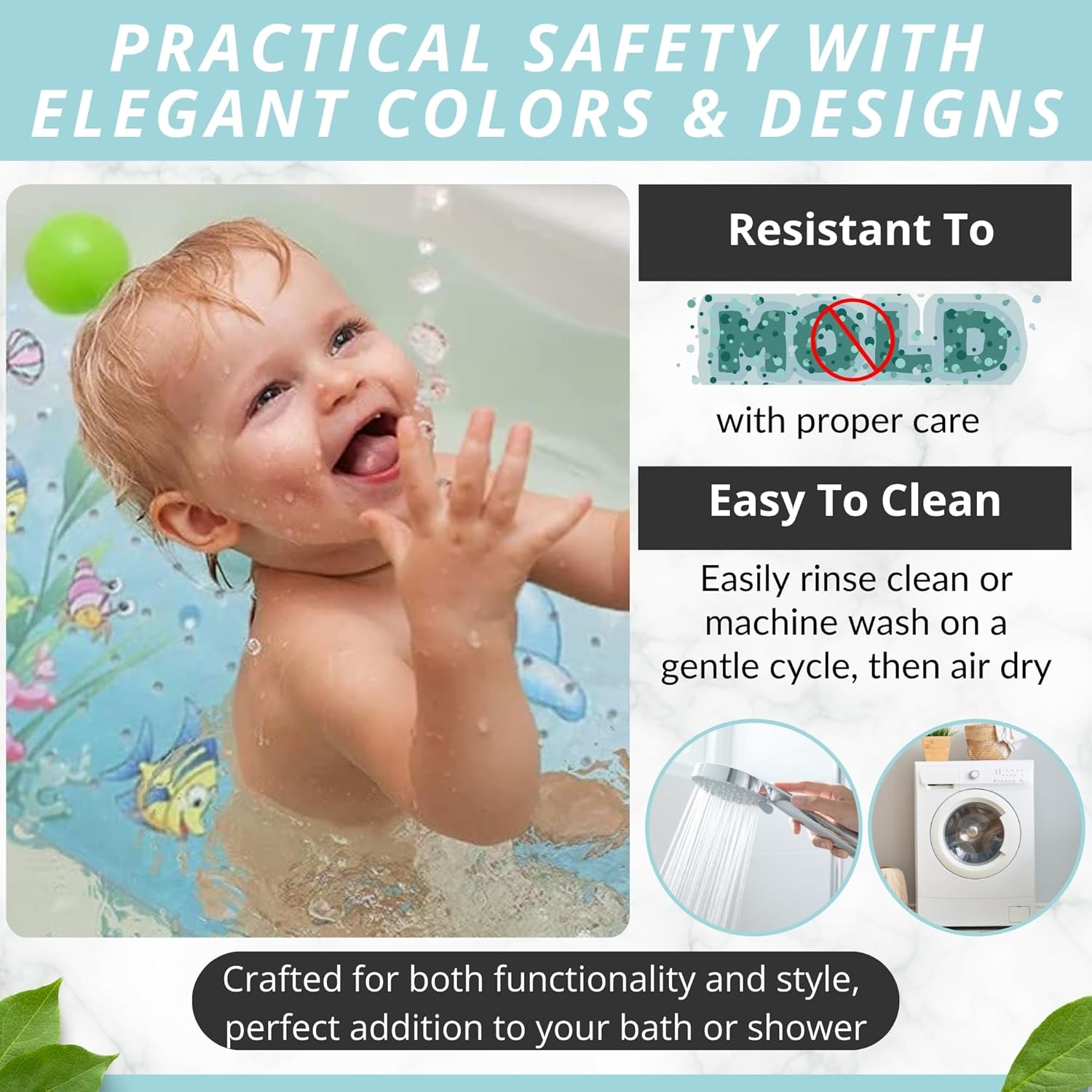 • EASY TO CLEAN Crafted from durable, easy-to-clean, and safe materials, this bath mat simplifies maintenance. Rinse it in the shower or tub, or toss it in the washing machine for a quick and convenient clean.