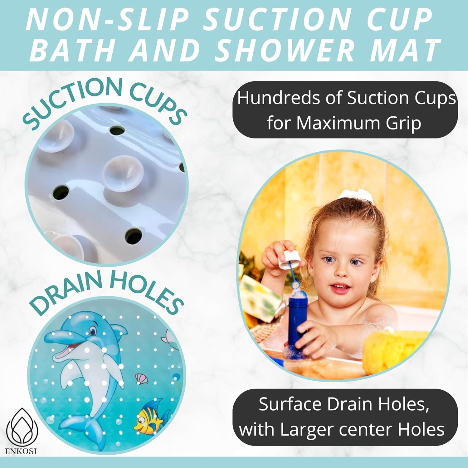 ENKOSI Bath Mat Long 40x16 – Non-Slip Bathtub Mat with Secure Suction Cups & Drain Holes with Fun Dolphin Design - Bathroom Shower Mat for Tub for Kids and Toddlers (Bath Dolphin)