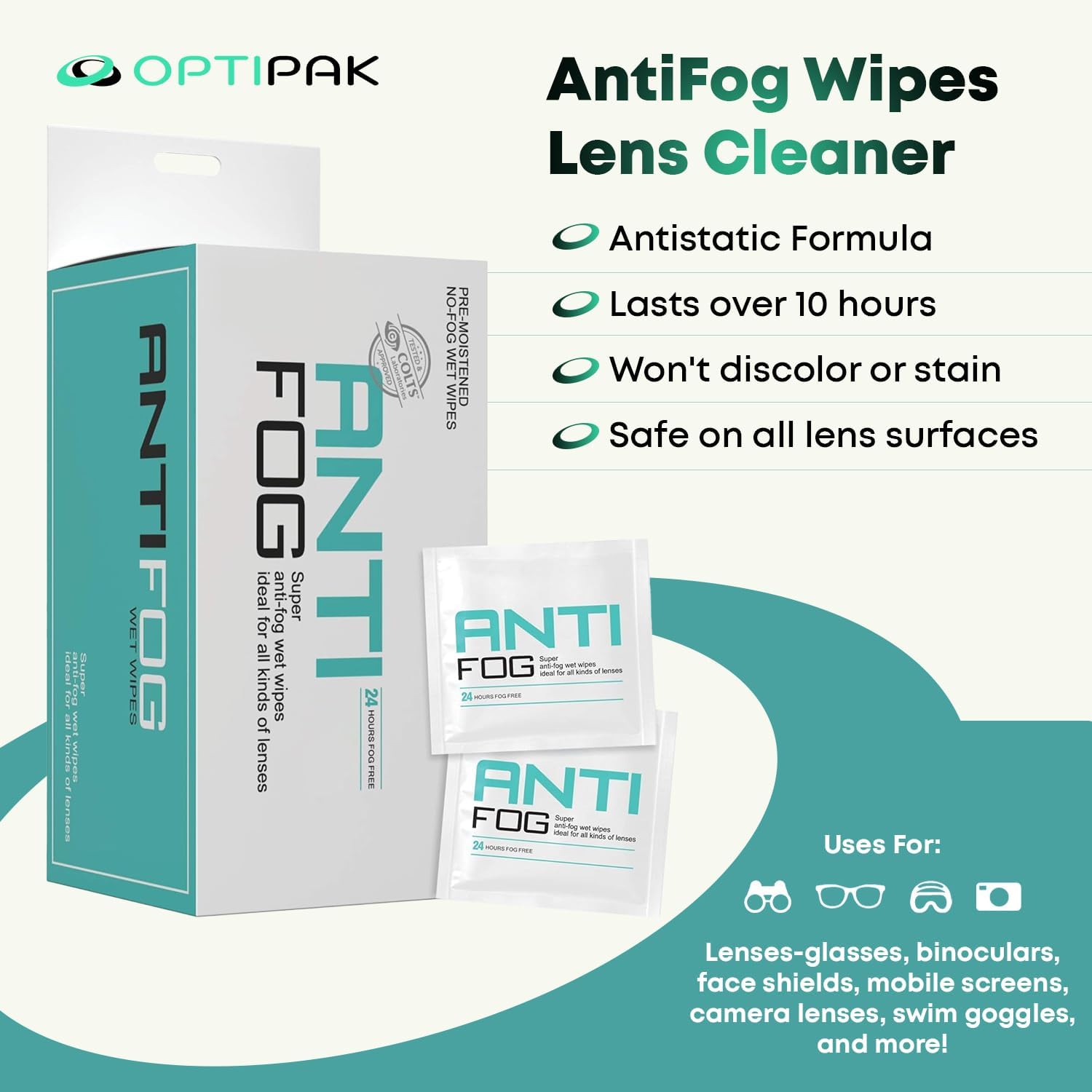 • Pre-Moistened Anti Fog Lens Cleaner Wipes: Optipak's premoistened glasses wipes clean and treat eyeglasses, sunglasses, goggles, and safety eyewear. Each individually wrapped wipe ensures clear, fog-free lenses in seconds.