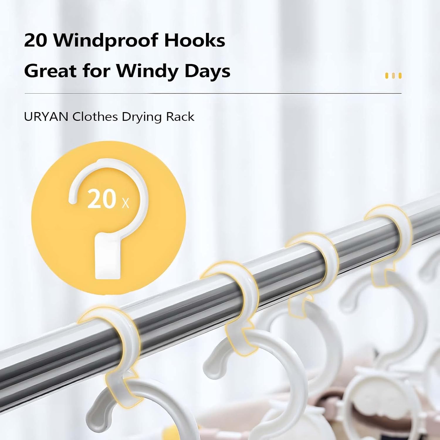 • Rust-Resistant Clothes Line: Made of rust-resistant stainless steel for long-term use. Includes 20 windproof hooks to keep clothes securely spaced, ensuring better airflow and faster, tangle-free drying
