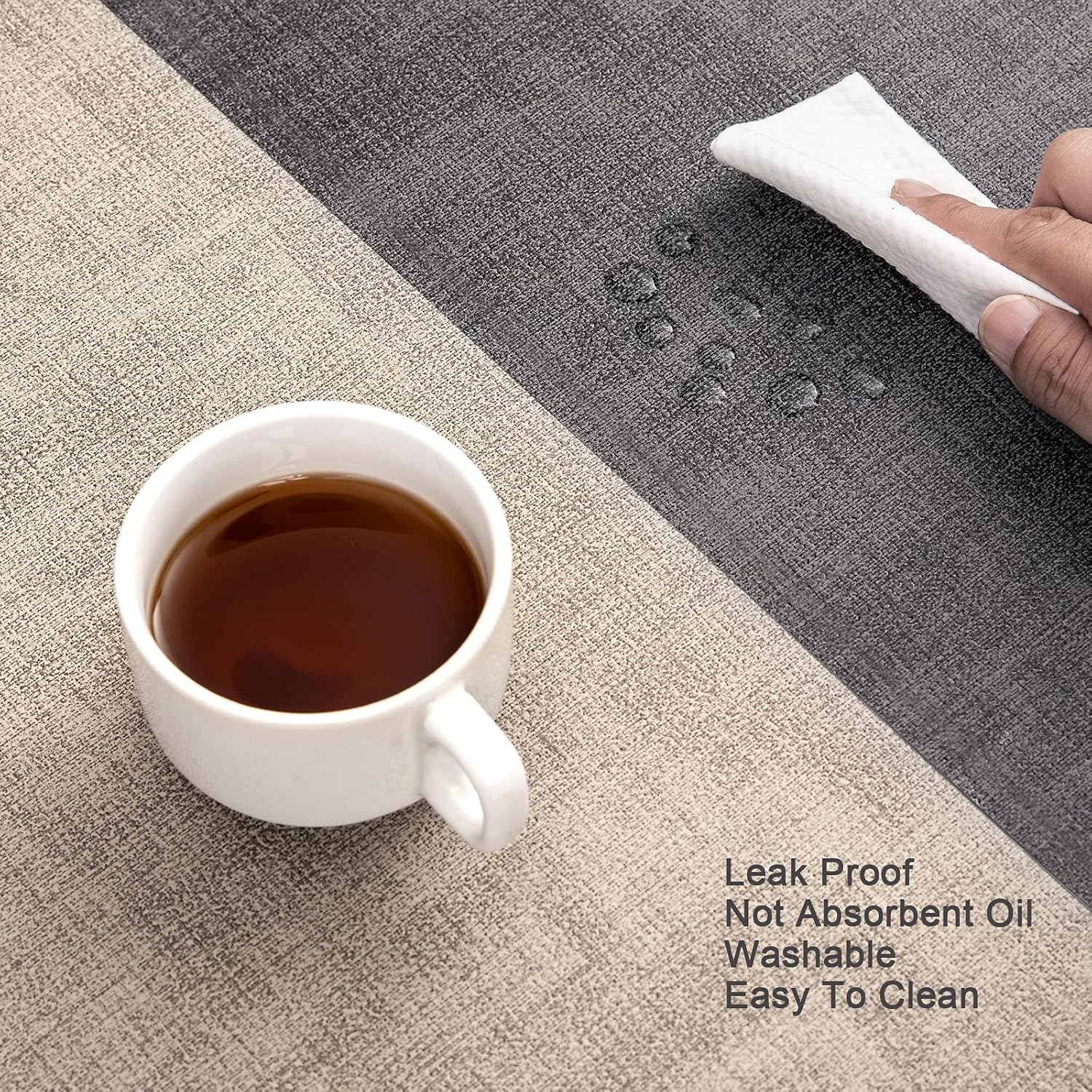 • These placemats are made of faux leather, the sufface texture imitate the linen. Unlike woven or fabric placemats, these placemats are water resistant, they can block the sauce or any liquids to protect the desktop.