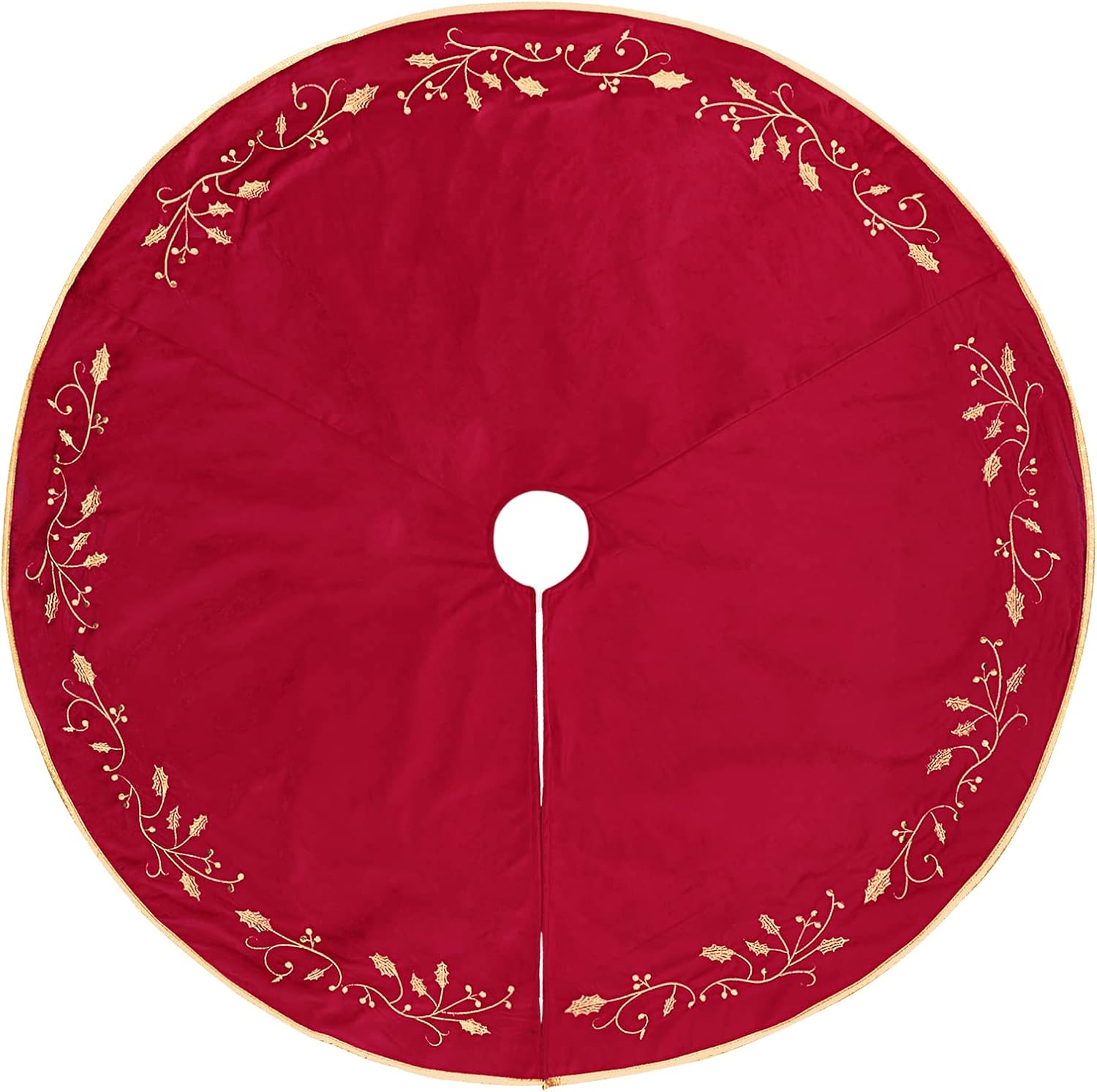• LUXURY EMBROIDERY DESIGN. Embroidered gold sequin holly leaves. Bring holiday charm red tree skirt featuring classic gold leaves to make a luxury Christmas feeling.