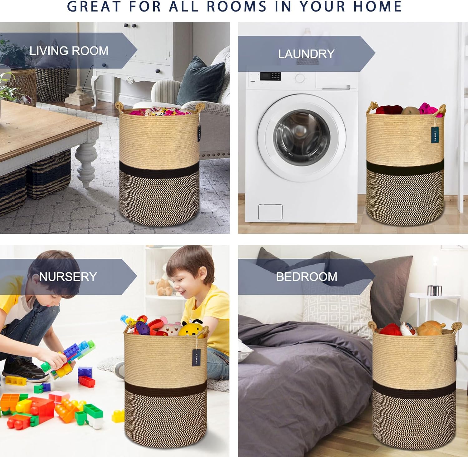 COMSE Extra Large Blanket Basket, Tall Woven Storage Basket, Nursery Hamper, 15.7”x 21.7”, Cotton Rope Laundry Hamper for Toys Clothes Towels, Blend Brown/Black