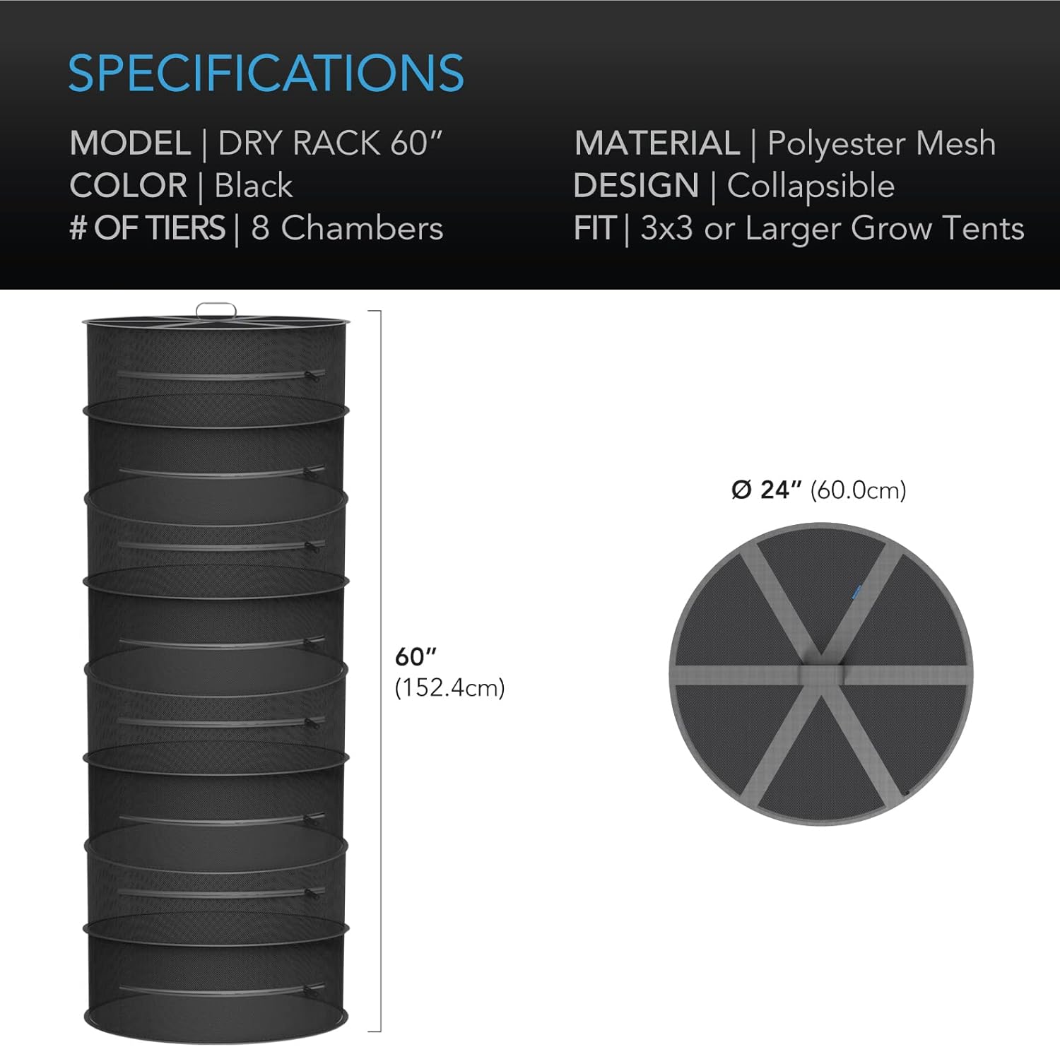 • 8 Tiers | 24 in. Diameter | Fits 3x3 or Larger Grow Tents | Includes Hanging Hook & Carrying Bag