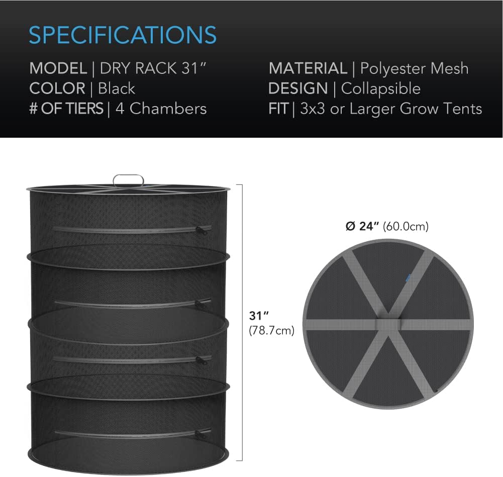• 4 Tiers | 24 in. Diameter | Fits 3x3 or Larger Grow Tents | Includes Hanging Hook & Carrying Bag
