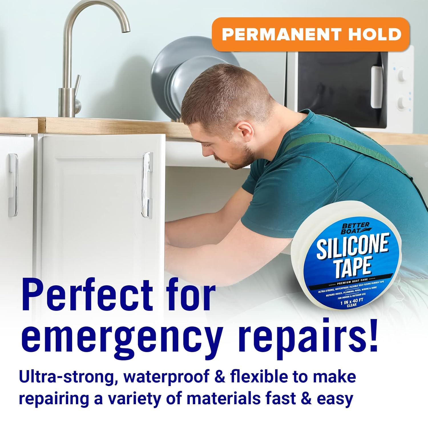 • PERFECT FOR RESCUE REPAIRS: Our premium grade self fusing silicone tape for plumbing, electrical and more is 1in x 40ft and clear. 100% silicone making it ideal as rubber electrical tape, wrapping rope ends and grip tool handles and even waterproof tape for leaks and plubming.
