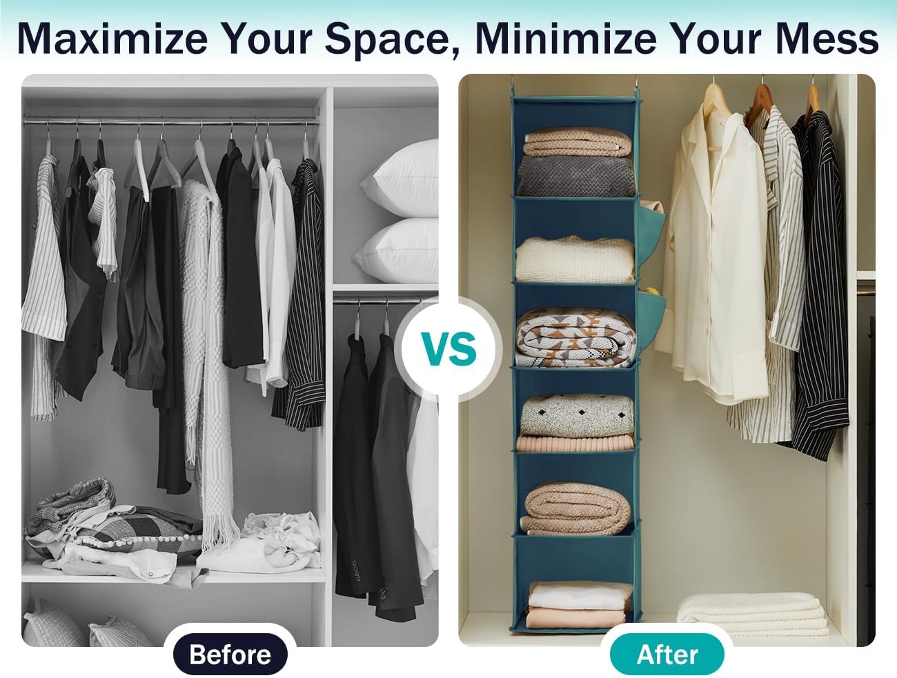 • 【Suitable】: Our closet hanging storage solution allows you to optimize your closet space. With six shelf units, it is perfect for individuals in need of additional storage but lacking sufficient closet space. It also offers an efficient space utilization option for those seeking to maximize their storage capacity.