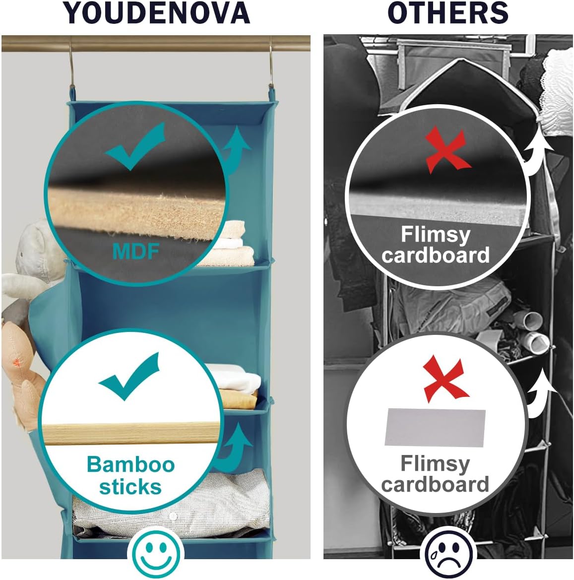 • 【High Quality】: Our hanging closet organizer is crafted from durable and thick non-woven fabric, ensuring long-lasting use. Unlike similar products, it features 2 sturdy bamboo sticks at each shelf and MDF board at the top and bottom, effectively preventing the compartments from bending.